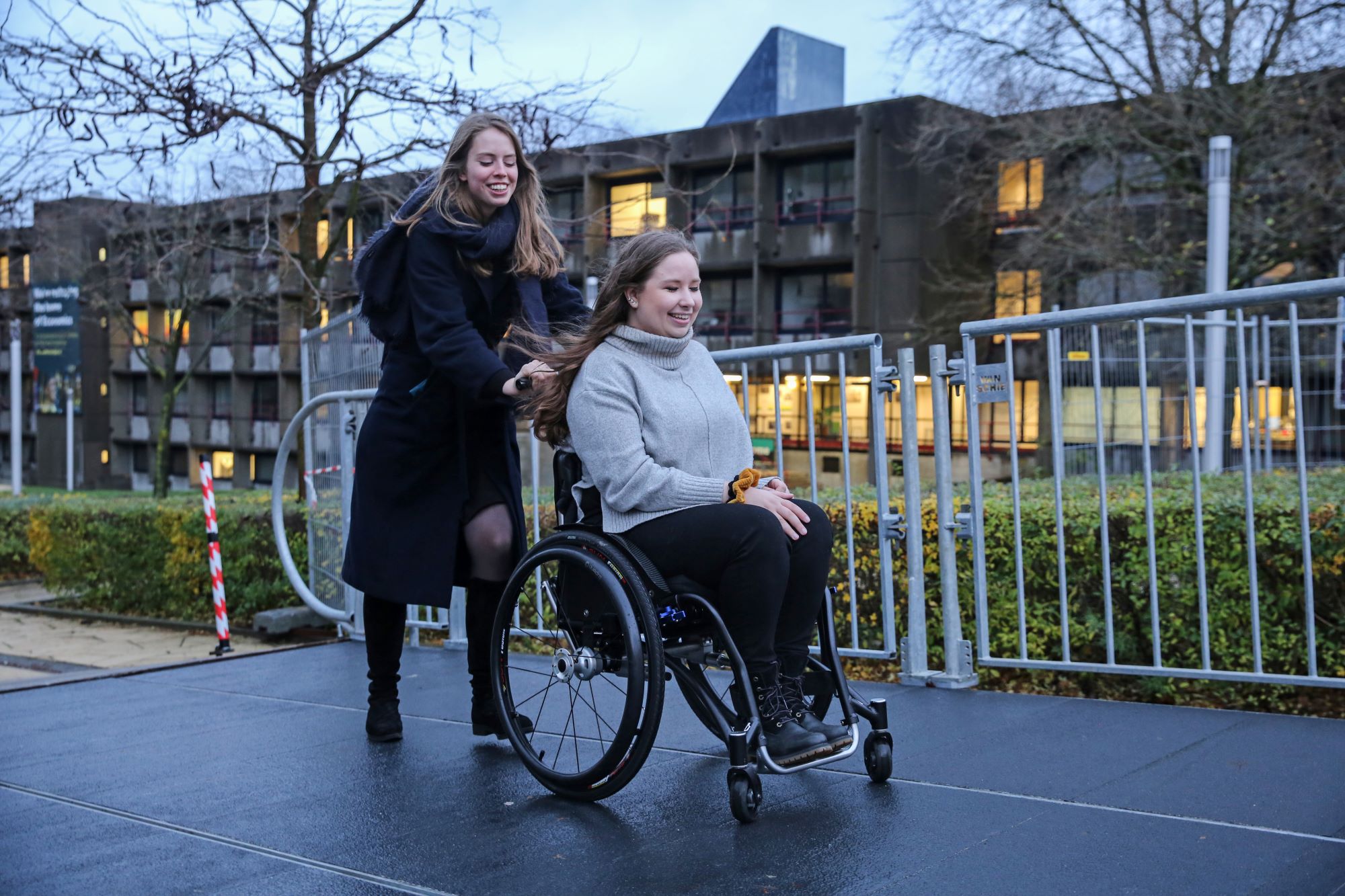 Just outside the university library, at the bottom of Institutenlaan, Kyra can move forward on her own. If it gets any steeper, she needs help from a friend. “When I had just started studying here and didn’t know many people yet, I used to drive my car between classes from the car park at Park Noord to a parking spot at Van de Goot. Otherwise I had no idea how to get to the buildings on the other side of the campus.” Georgina’s calves have to be put to work if she has to cross the bridge over the road. It’s here temporarily because there’s work going on, but it is an extra inconvenience. “And it’s slippery with this rainy weather,” Georgina points out. “If I slip, Kyra will roll downwards.” That makes the two of them laugh, not so much because they think it’s funny, but because it’s “too bizarre for words”. “Excuse my language, but it really is shit”, is how Georgina describes the situation.