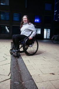 Then she has to go around it on the way to the Polak building. Once there, Kyra often has to wait a long time for the lift. Sometimes twenty minutes. “There are only two lifts for the whole building and there are a lot of students”, Kyra tells us. “So I join the queue at the lift, but with my wheelchair I take up more space than people without wheelchairs. So I don’t always fit. Especially in the second lift, because it’s smaller. And people aren’t always very helpful. Students sometimes even tell me that they don’t have the time to hold the door open for me.”