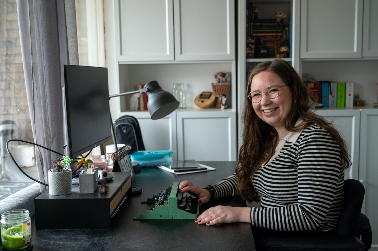 Kyra’s home is her canvas. A nook in ‘her’ room has been painted a shade called A0.10.50, which is a shade of pink. The wood panels in the hall have been painted ‘vintage blue’, a bright shade of light blue. Kyra Mulders, 23, likes to paint and draw, has recently begun to create buttons of epoxy resin, and also likes to build things out of Lego bricks. A bouquet made out of Lego pieces sits on a sideboard. The project she is currently working on, a typewriter made out of mint green Lego pieces, sits next to her computer.