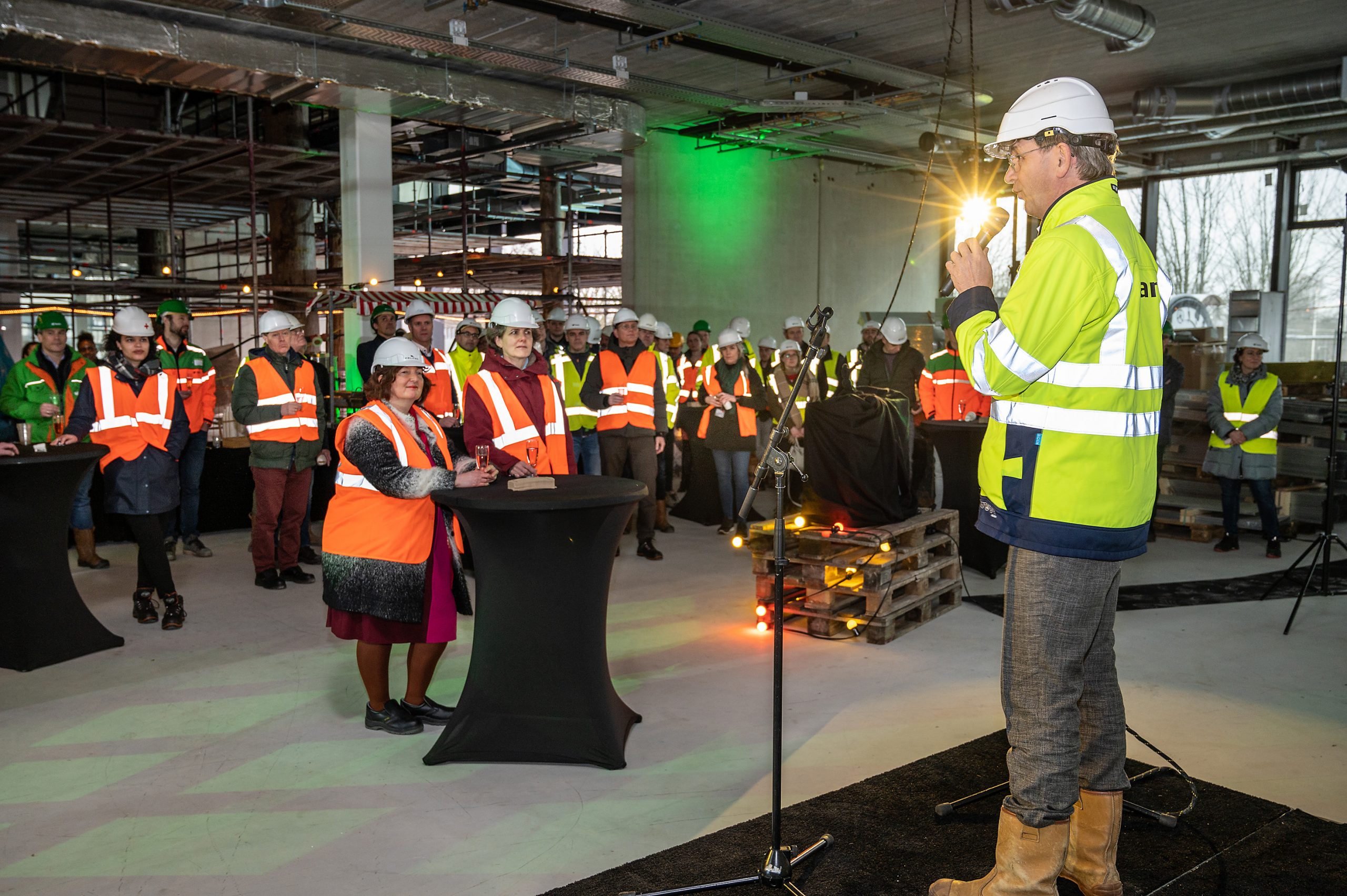 Director Ellen van Schoten and Peter van Leeuwen from BAM Bouw en Techniek raise a toast with a glass of alcohol-free bubbles. They stand proudly on a small stage. Van Schoten: “From my office opposite, I’ve seen the building gradually taking shape. Everyone has been working extremely hard. I’m sure that this will become a bustling place.” Van Leeuwen is also enthusiastic about the project: “I soon noticed that EUR and the BAM have the same sustainability ambition: a carbon-neutral building with reused materials. At the same time, this is also a very innovative building. The university does not shy away from the fact that if you want sustainable quality, you sometimes need to invest more.”