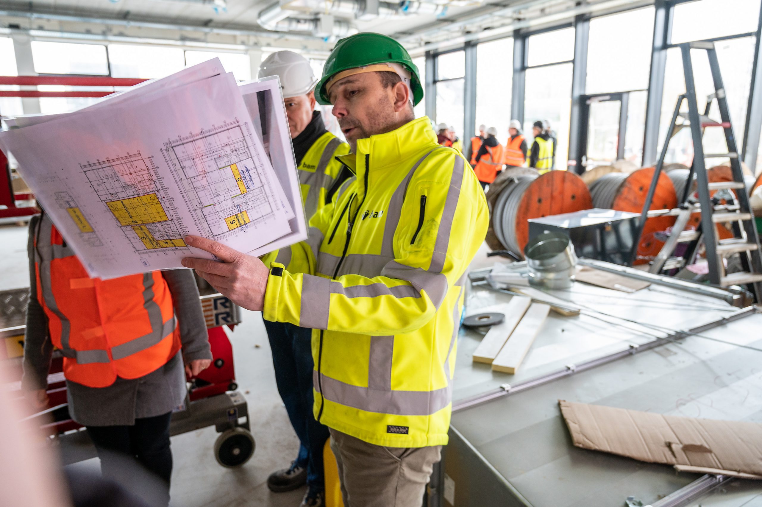 After the introduction ceremony, five project leaders take those interested on a tour. Guide Bas van der Zandt, normally responsible for the electrical engineering, is enthusiastic about the building.
