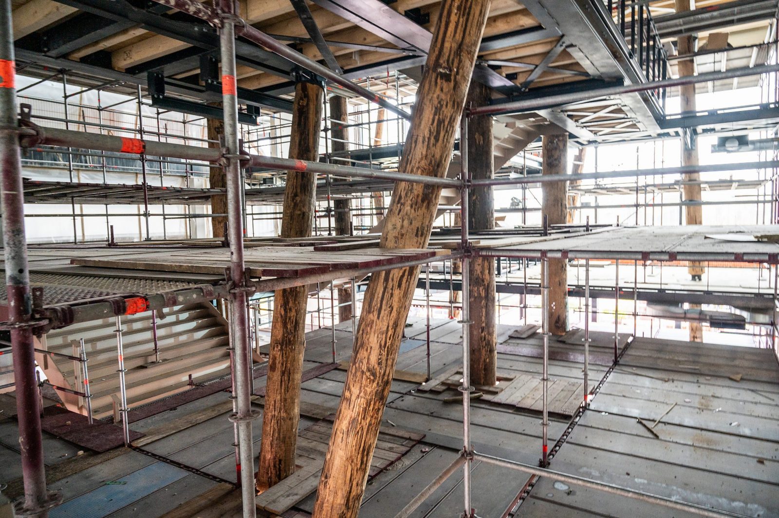 In the central hall, also called the atrium, there are twenty individual Douglas fir tree trunks which support the floating plateaus and footbridges. The thick trunks are eighteen metres high and are up to sixty centimetres in diameter. A large staircase dominates the middle of the hall. Next to the coffee bar, there will also be a lounge on the ground floor.