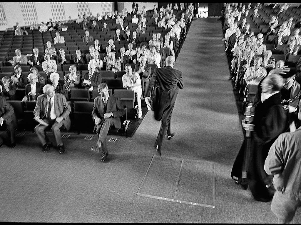 Then at long last, after half an hour, a few professors in robes trickle into the auditorium. They all bashfully greet the balding man behind the lectern. They are only there out of a sense of duty; they would rather not talk to professor Pim. After a caustic farewell lecture entitled ‘Your job is on the line. The consultation economy is over’ Fortuyn theatrically casts off his toga and angrily storms off the stage.