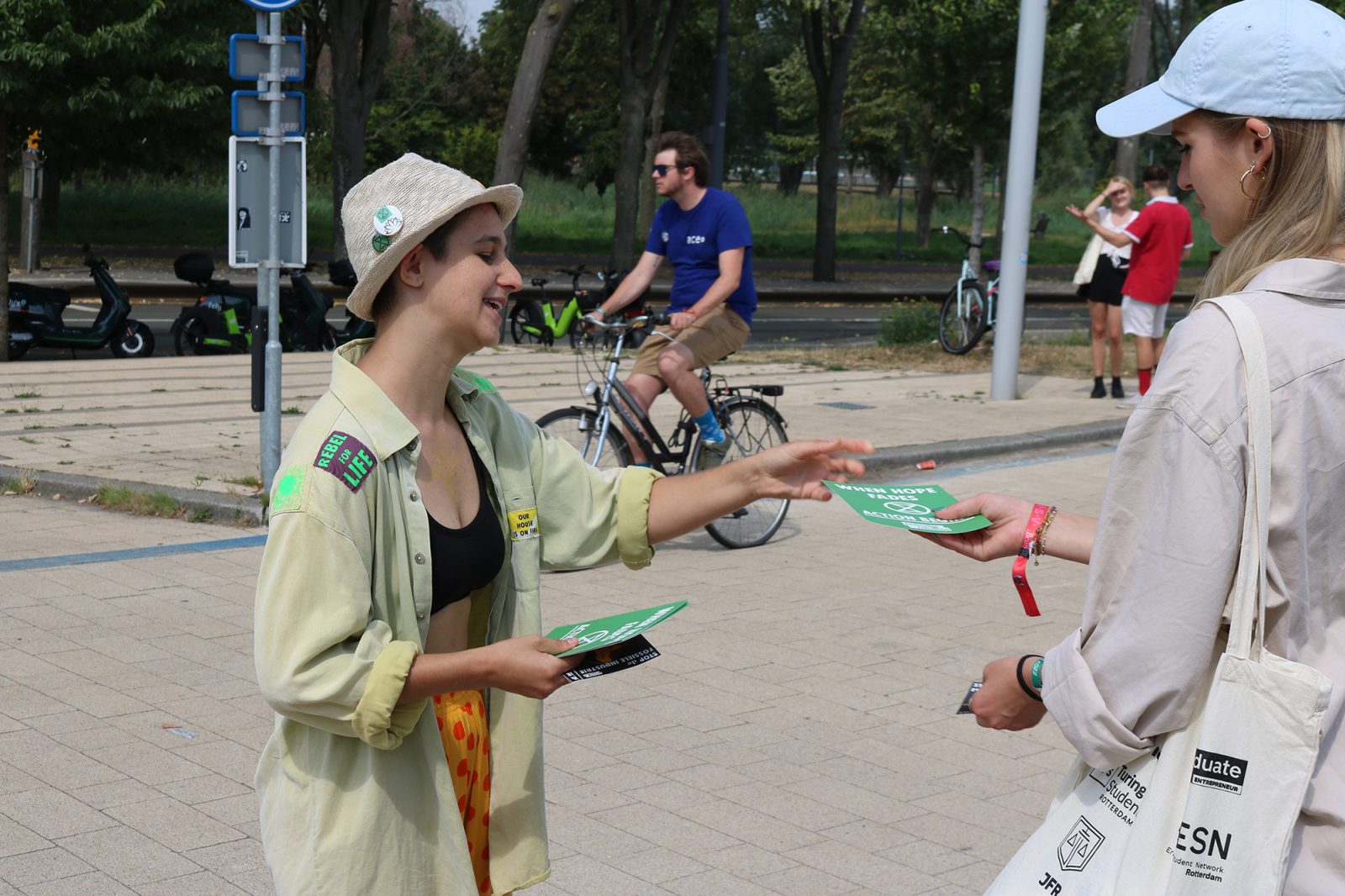 “We would like to raise awareness about sustainability and climate issues, especially among new students,” states member and EUR-student Adriana. “We think it’s important that first-year students get the message right from the start of their studies about how bad things are.” She and another member parked themselves at the tram stop from ten in the morning. “We plan to stay here until the end of the afternoon. Luckily, two other members will arrive in another hour, so we can take a break then,” she adds.