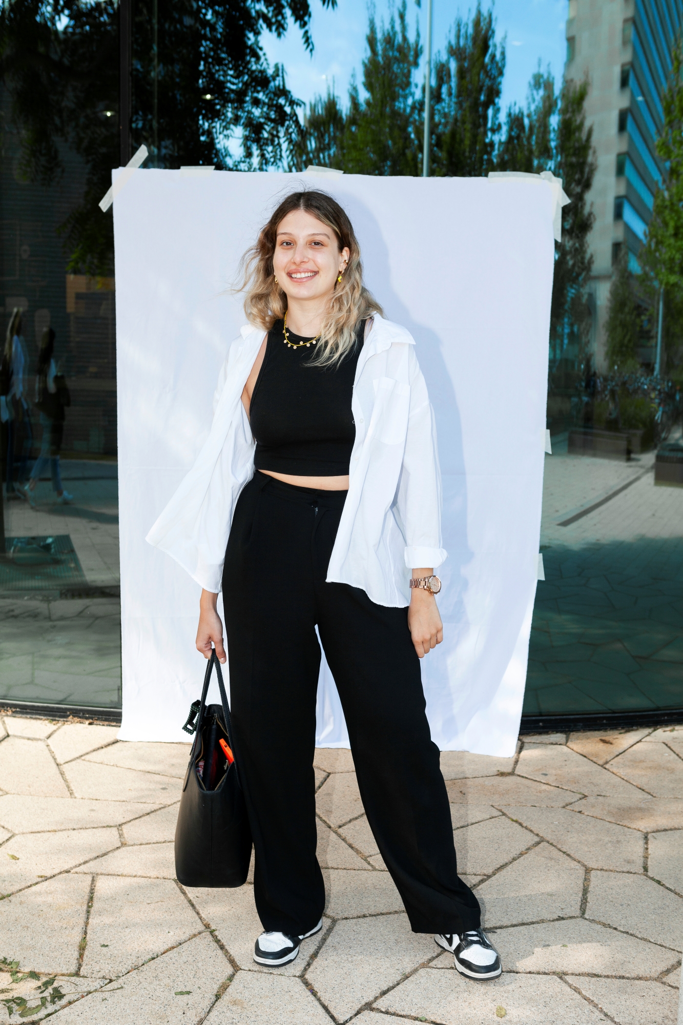 “I wear this yellow necklace a lot. The colour yellow is summery and gives off festival vibes. I don’t wear any other bright colours. They might look good on other people, but I prefer monochrome. I mainly picked this outfit for comfort, so that I could get a few more winks during my first lecture at 9 am. My dress style is more formal than during my first year, when everyone wore sweats because of the coronavirus pandemic.”