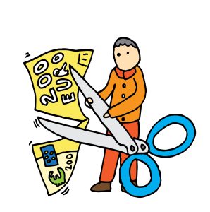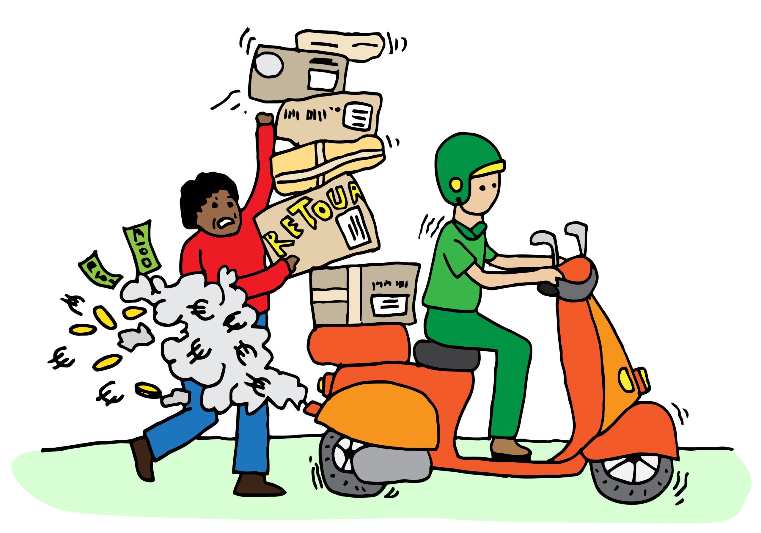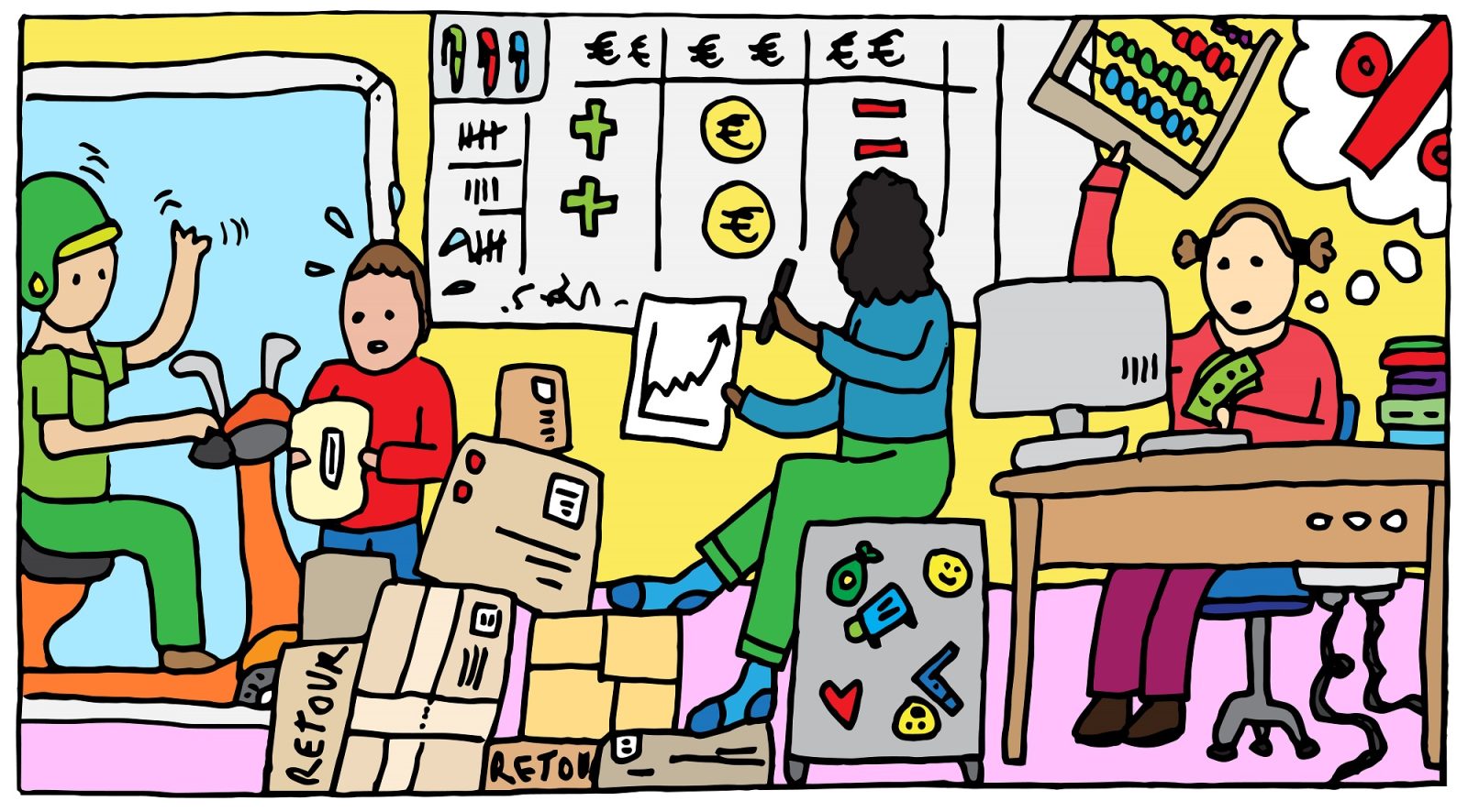 In Stage 2, the debtor sends some of the stock back (the emojis show clothing, a van and a sad face). How should this be entered into the balance sheet? “Imagine that the returned products total 100 euros. We enter ‘Sales returns’ on the debit side and ‘Debtors’ on the credit side, both showing 100 euros. That allows the revenue to be corrected in Stage 3, where we have ‘Cash’ and ‘Debtors’ with 300 in the balance.”