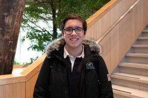 On the second floor, students Yasmina Wacher and Nefeli Poulipoulou concentrate as they work on their laptops. The sun shines through the window next to them, which overlooks the Plaza and the pond. Both have been looking forward to studying in this building for weeks. “When the university announced the opening of the building on social media, I tagged Yasmina with a message: ‘We have to check this out!’” Nefeli says.