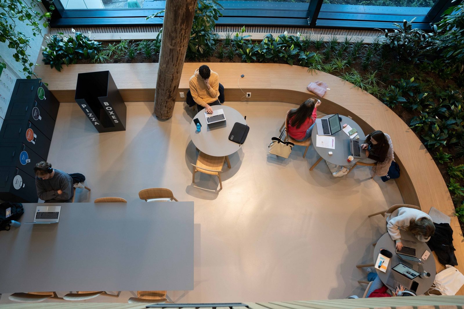 When you enter the Langeveld Building, it looks green and natural. The staircase meanders through the middle of the room, next to metres-high tree trunks that serve as pillars. Seating and tables surround a square ‘garden’ with a tree on the ground floor. Rows of lush dragon ivy adorn the walls like a green waterfall.
