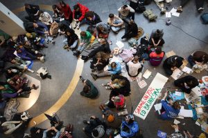 Around 6pm, the police asked the group students and staff who had been occupying the Sanders building since Monday morning to leave the building. About 25 police stood inside or around the entrances of the building. At the time the police entered, about eighty students and staff were present. About ten activists refused to leave and were led away.