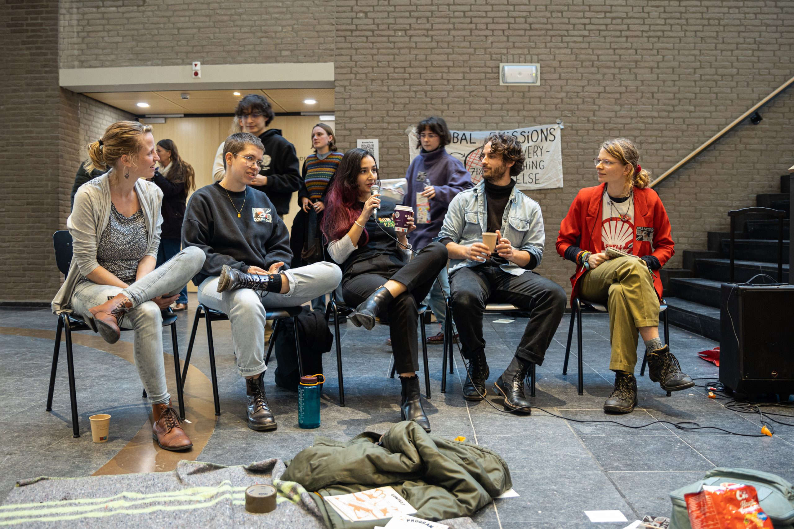 After the opening speeches by Hüzeir, Professor Alessandra Acuri and others draw to a close, campaigners spread out in the Sanders Building’s foyer. Some of them write messages like ‘Ed Brinksma, shame on you’ on banners or hand out flyers, while others read books or participate in a clothes repair workshop. The atmosphere is relaxed, with 60 to 70 campaigners on site, even if the foyer does get a bit crammed during break times or at the end of a lecture. A gaggle of econometrics students tries to weave their way through the campaigners. “Bloody nuisance”, one of them sighs.
