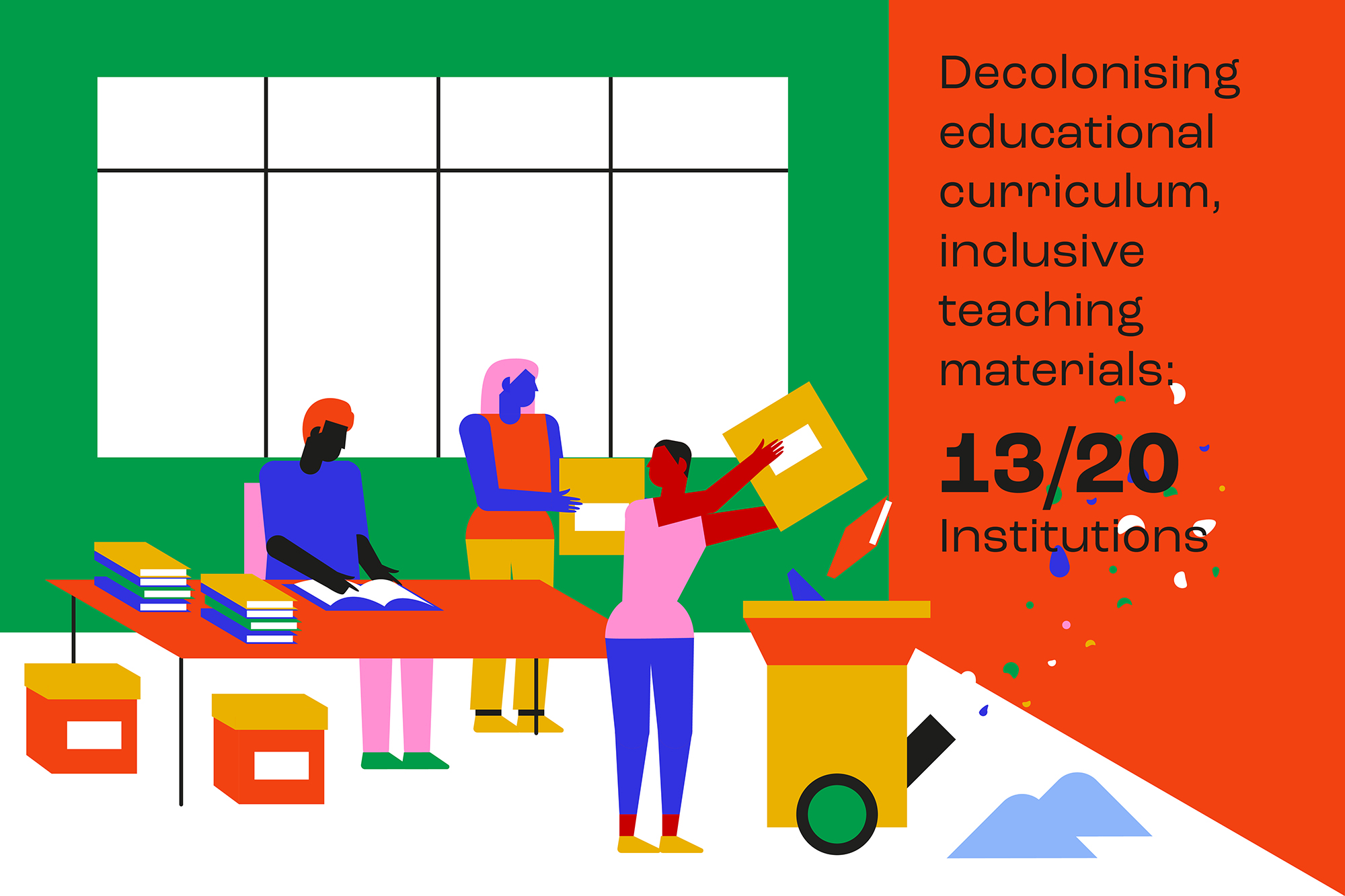 Of the twenty institutions studied, thirteen have said they are examining their teaching material in order to make it more inclusive. Sometimes this is called ‘decolonising the curriculum’, sometimes ‘making education more inclusive’. Curricula are often founded on European or Western perspectives. Institutions and teachers thus try to make room for other perspectives. For instance, by covering more non-Western thinkers or not just using heteronormative examples in lectures. Erasmus University does the same, for instance by training lecturers. Initiatives for more inclusive education are also emerging from lecturers themselves, for instance in response to Black Lives Matter two years ago.