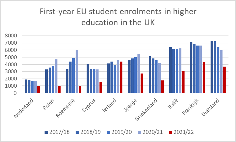 In September 2017, 1,900 Dutch students enrolled for the first year of an undergraduate or postgraduate course in the UK. That number eroded, but declined sharply to just one thousand at the start of the 2021/22 academic year, when changes in fees eligibility pushed up the cost of studying in the UK for EU students. They can no longer pay the same home fees as British students, and fees have now risen as high as 38,000 pounds a year, i.e. almost 43,000 euros.