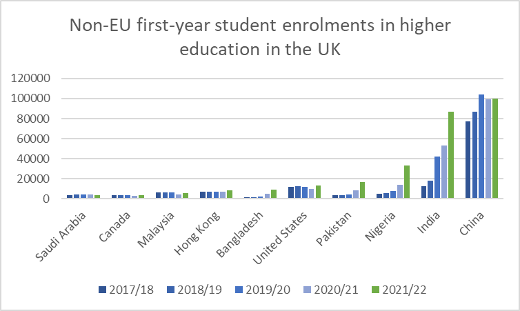 At the same time, however, UK universities are attracting far more students from non-EU countries. The numbers are significant, with more students now coming to the UK from Pakistan and Nigeria than ever came from an EU country.