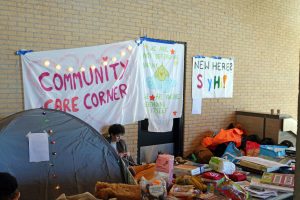 Besides a camping tent and some pillows, the care corner is equipped with first-aid kits, snacks, menstrual products and books, among other things. “We are provided to be able to stay for a longer period of time, as we plan to be here for as long as we need.”
