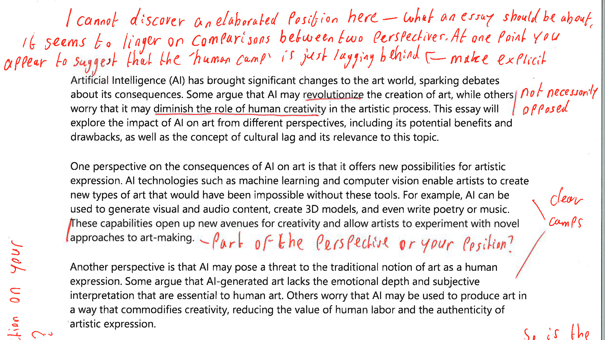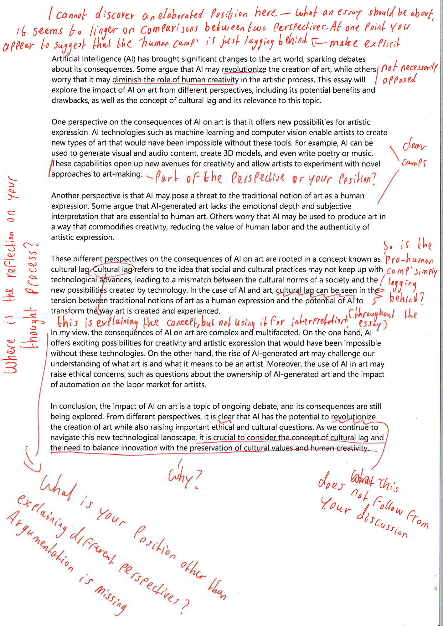 The essay starts by describing two different perspectives: AI as an enrichment of art and as a threat to art. According to one perspective, artificial intelligence makes new forms of art possible, for example, while according to the bot’s other perspective the resulting art lacks emotional depth and subjective interpretation. It then provides the definition of the term ‘cultural lag’ in a single paragraph. The bot then shares its own perspective, in which it says that the consequences of artificial intelligence are complex and multi-faceted. The conclusion: it is crucial to consider the concept of ‘cultural lag’ and to ensure that innovation does not stand in the way of cultural values and human creativity.