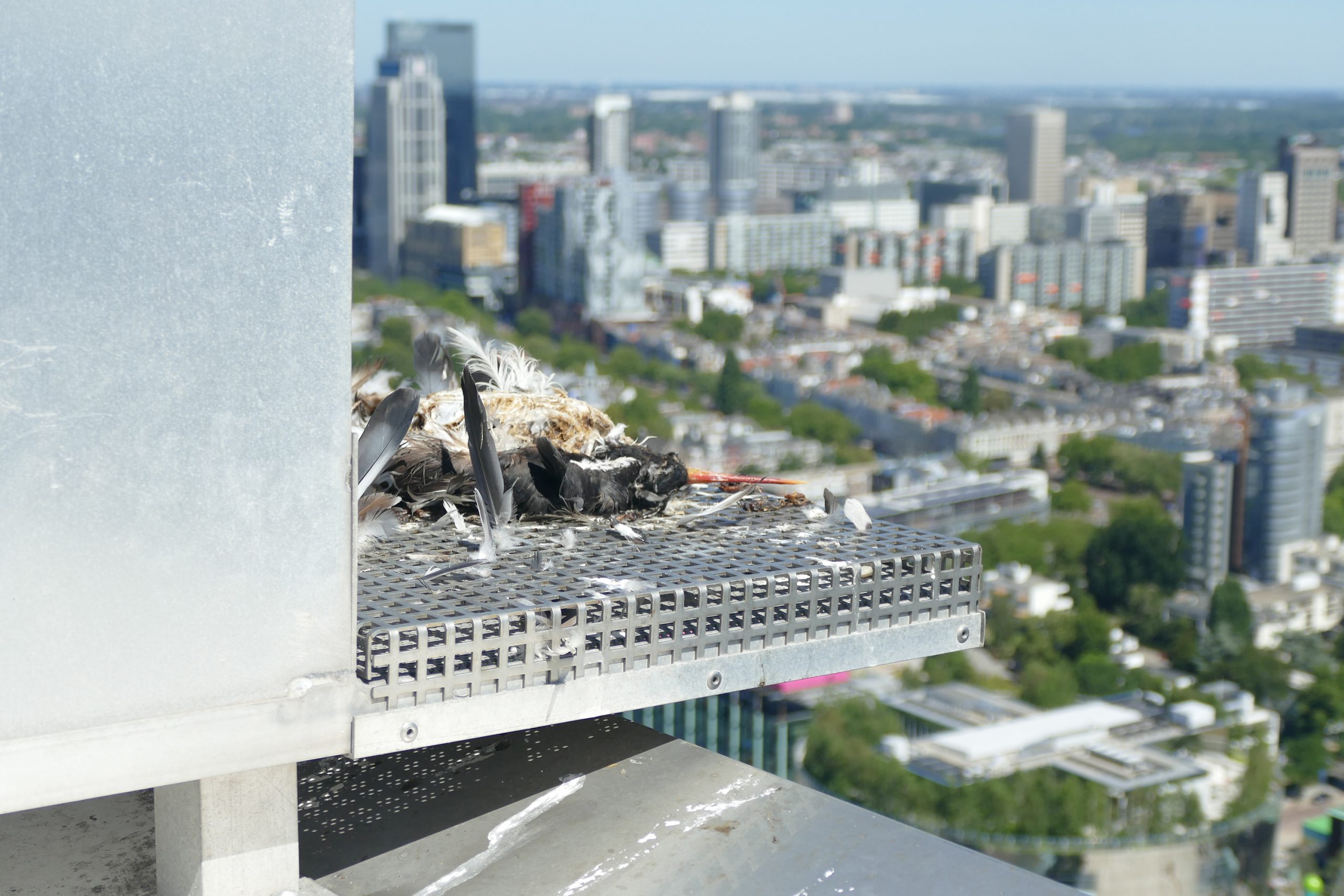 Papa peregrine looks down from the blue ‘m’ in the Erasmus logo at the very top of the right-hand towers. From his bed, you might say, as peregrine falcons like to sleep on the blue letters on the thirtieth floor (120 metres up). The mother of the family is easy to spot: female peregrines are clearly larger, roughly the size of a buzzard at 40-60 centimetres. The males are about the size of a black crow. On this Wednesday morning, three of this year’s four young falcons are enjoying a flying lesson, circling the building while emitting shrill cries. “You can clearly hear the young begging for their food”, says ecologist Garry Bekker from the Rotterdam Urban Ecology Unit. “This is their morning routine.”