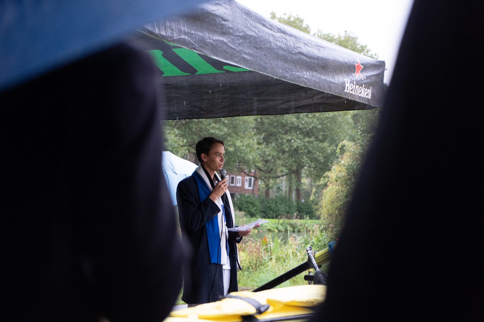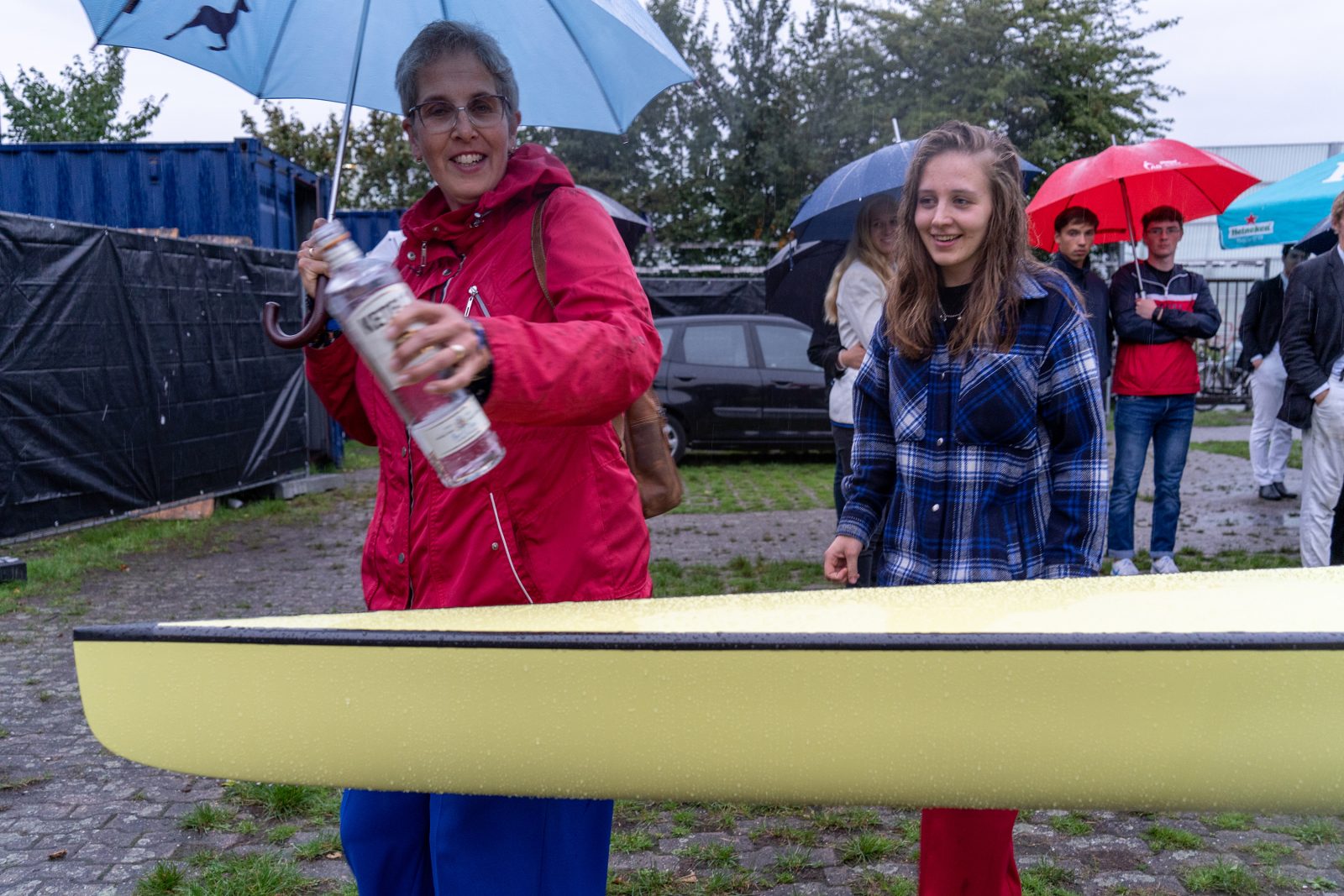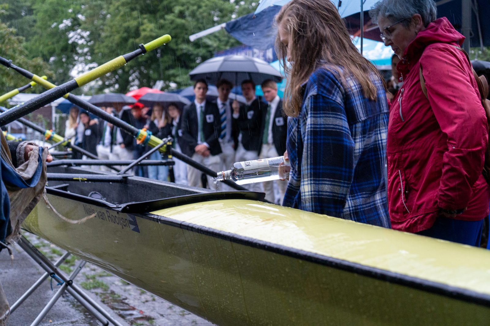 For Skadi, the christening of a boat always goes hand in hand with the house drink, Ketel1 jenever. The honour of christening the boat went to Niels’ mother and sister. They poured the contents of the bottle over the narrow, yellow boat, while Niels’ friends, family and fellow rowing club members looked on from under their umbrellas. Beside the club’s base on Noorderkanaalweg, Niels’ old team then stepped into the boat. They were given the honour of rowing the first metres in the new boat.