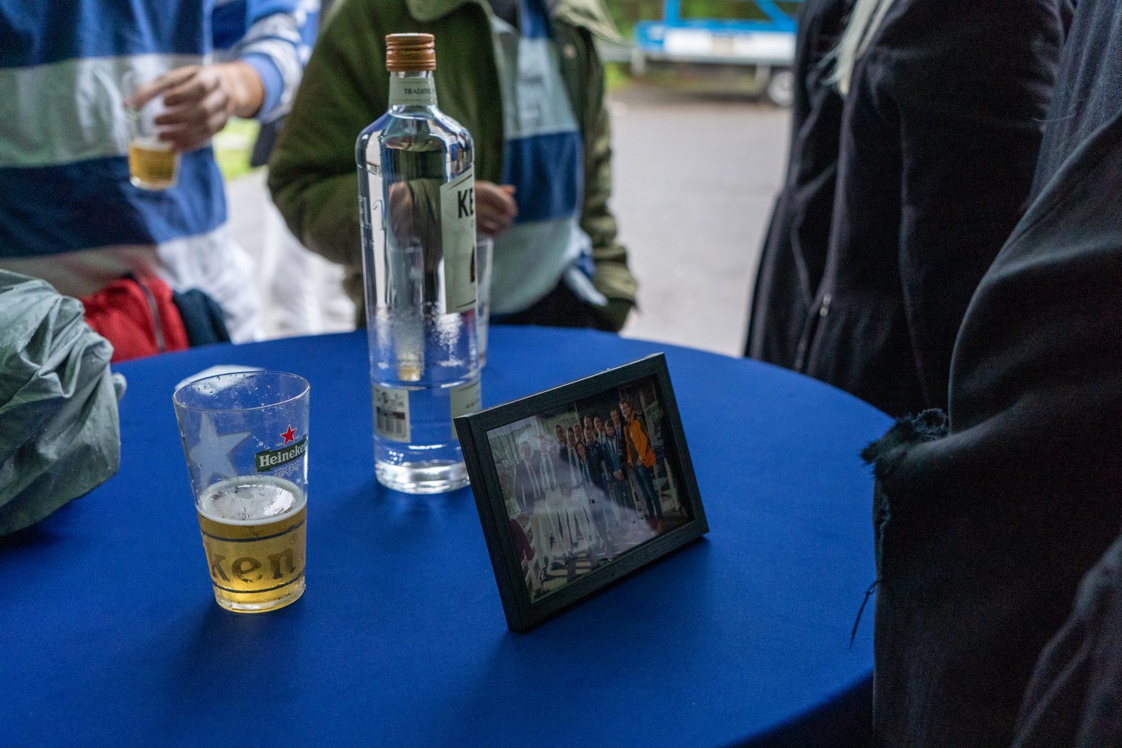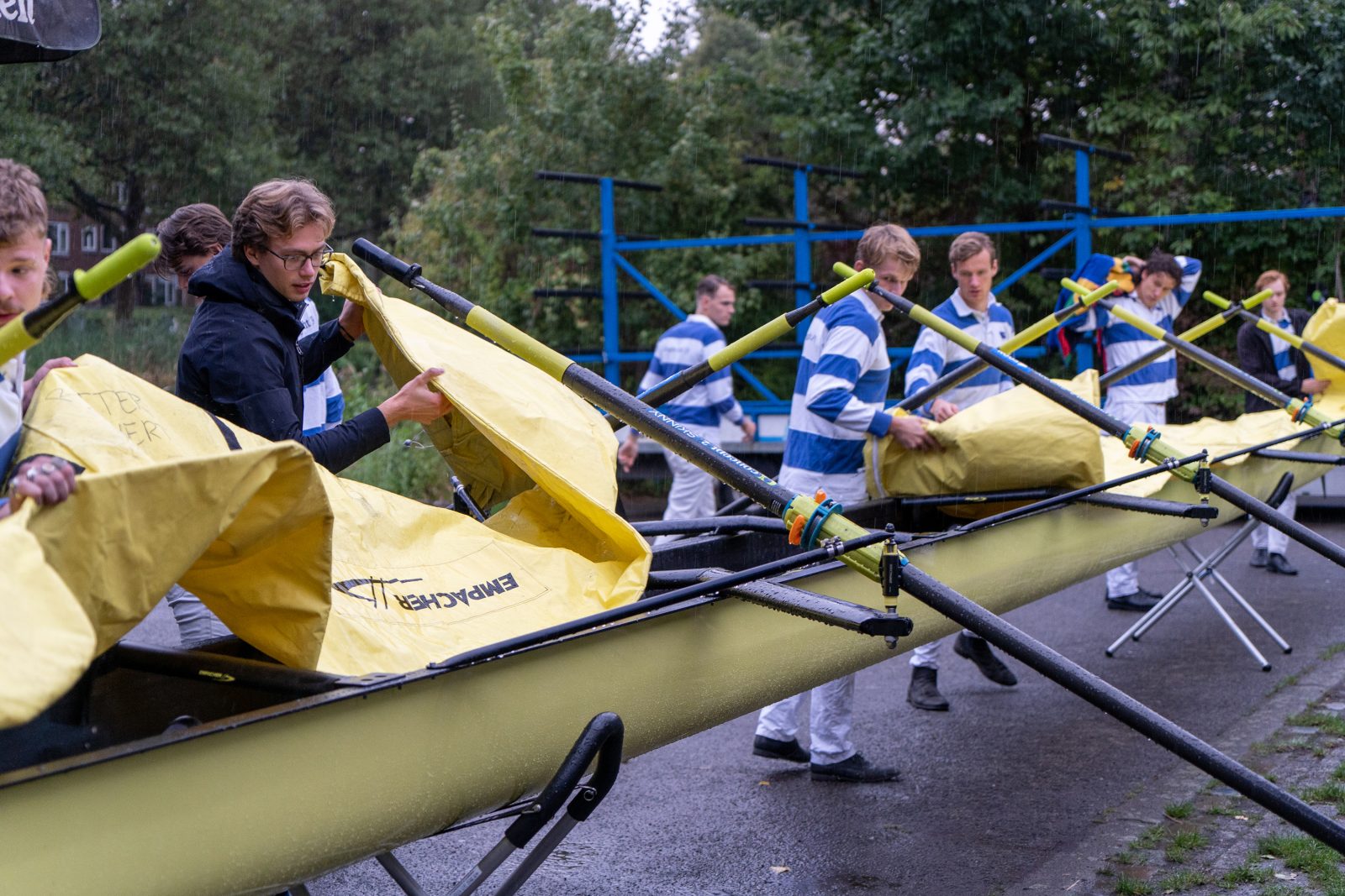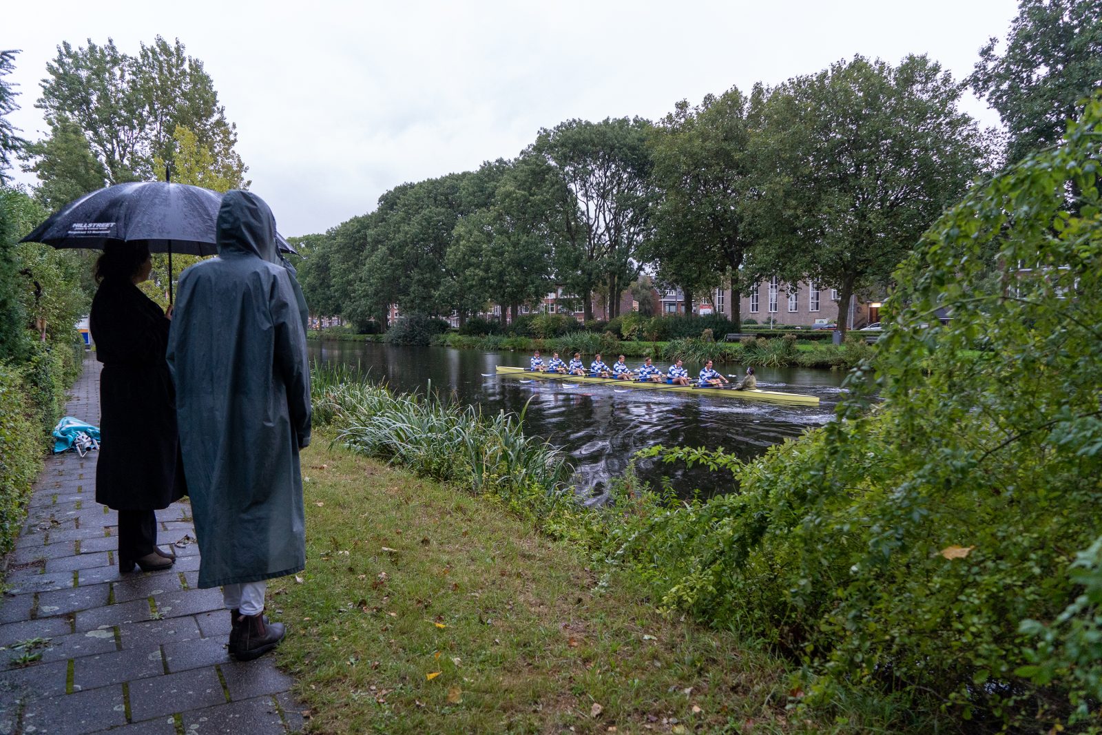 For Skadi, the christening of a boat always goes hand in hand with the house drink, Ketel1 jenever. The honour of christening the boat went to Niels’ mother and sister. They poured the contents of the bottle over the narrow, yellow boat, while Niels’ friends, family and fellow rowing club members looked on from under their umbrellas. Beside the club’s base on Noorderkanaalweg, Niels’ old team then stepped into the boat. They were given the honour of rowing the first metres in the new boat.