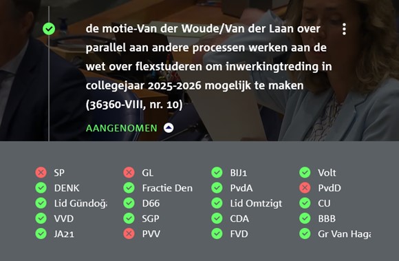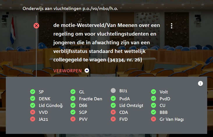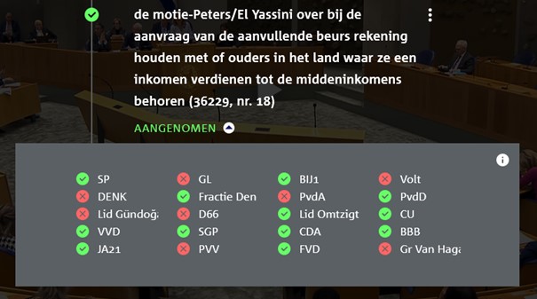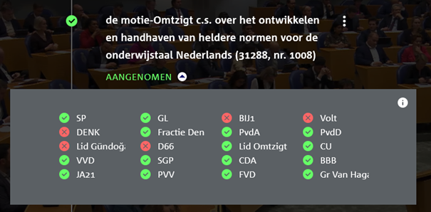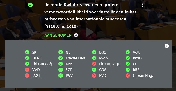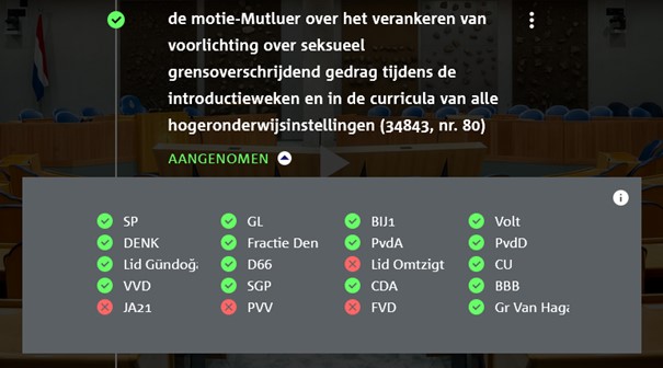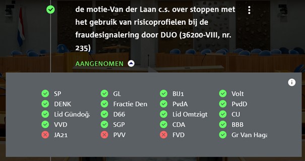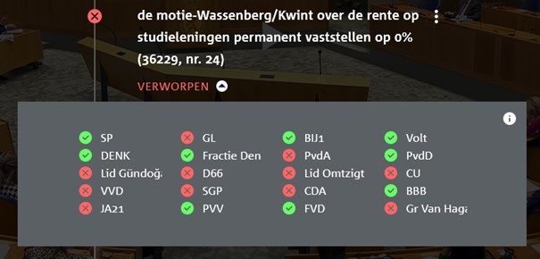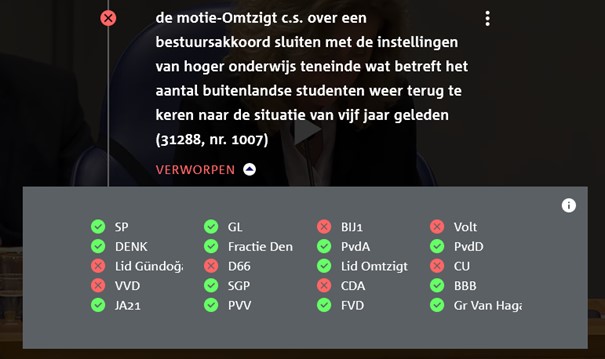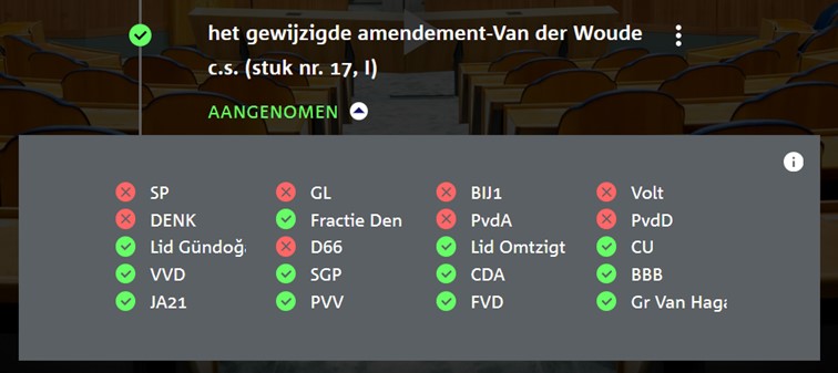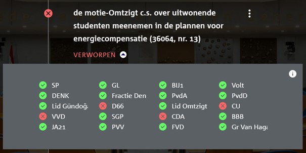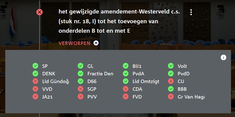 The images below show what parties voted against (red dot) and in favour (green dot) of  the motion or amendment. They also show if the proposal was approved (‘aangenomen’) or dismissed (‘verworpen’).