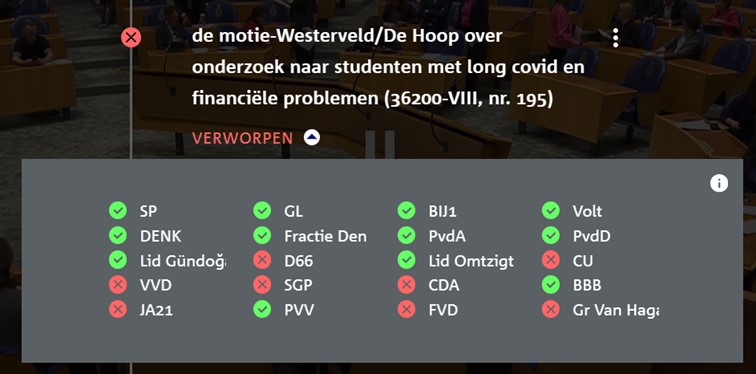 Please note the striking difference with the previous motion: the VVD has voted down the motion on this occasion, whereas D66 is in favour of the idea. Pieter Omtzigt also appears to have voted against the motion, although this must be a mistake, given that he was one of the parties who proposed the motion.