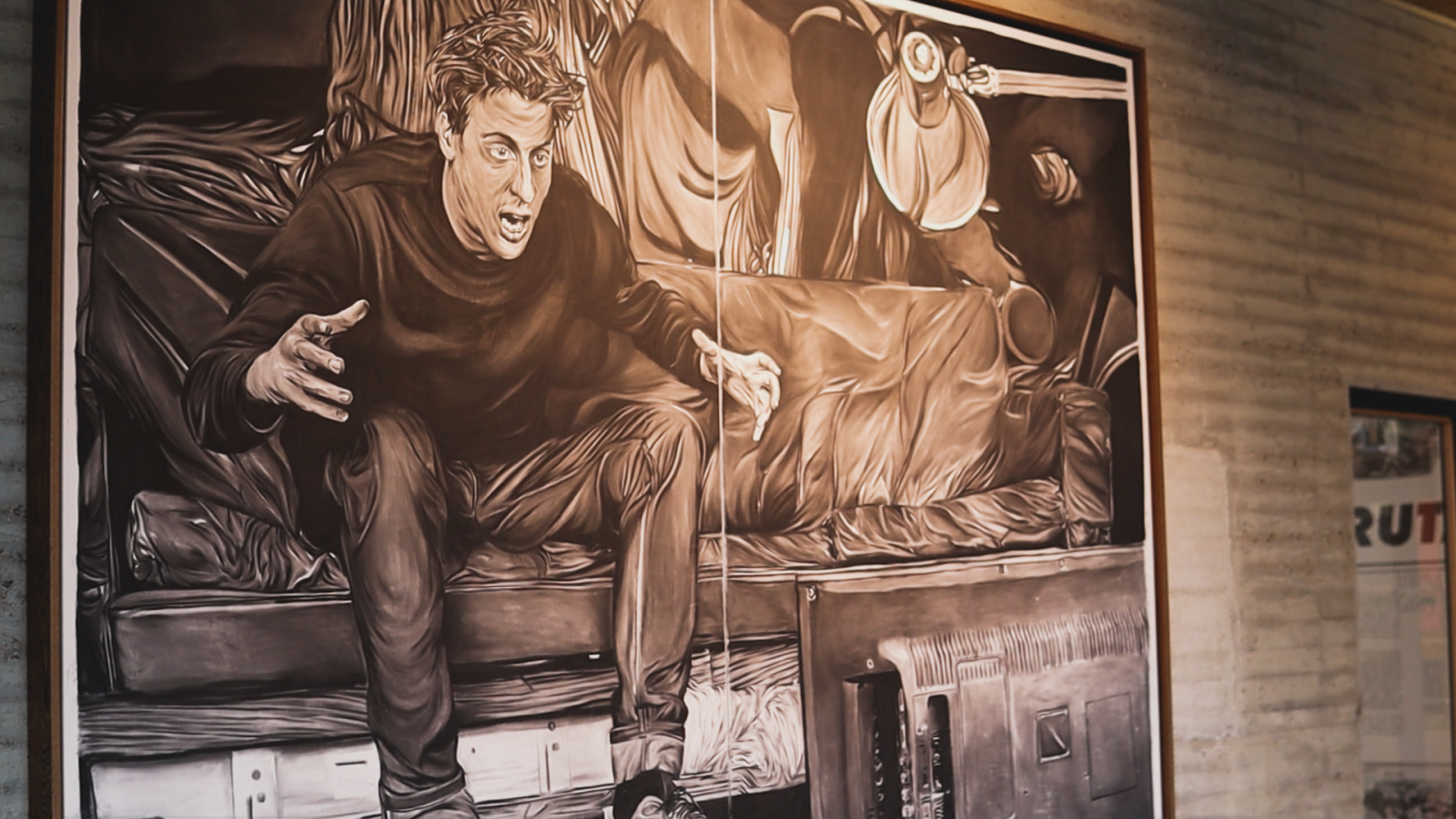 The work depicts the world behind the TV screen during a football match. In black tones it catches the atmosphere full of adrenaline and the reaction of a passionate sports fan. Although it looks complex, Luuk Bode, artist himself and working for the art department, explains the simplistic technique of Van de Velde: ”It’s charcoal on linen, a very basic material. It is impressive that you only have a piece of charcoal and you can draw this huge adventure with it”