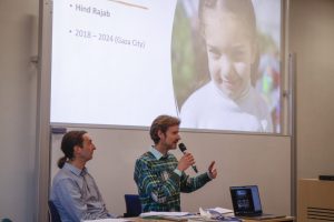 Birzeit student Ahmad Sabobeh summed up what has happened to Palestinian students since 7 October. “Sixty students have been captured, forty of whom as yet without explanation. We don’t have enough equipment and resources for laboratory work. Also, it’s really difficult for us to get to the university because of all the checkpoints in the West Bank.” He stressed that his experiences in the West Bank are relatively insignificant compared with the war violence faced by students in Gaza. Amir Khalil explained how Israeli universities are complicit in the violence that is currently taking place in Gaza, which he called genocide.
