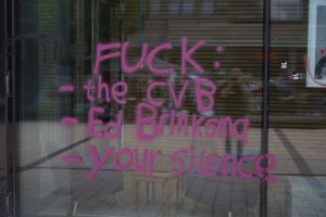 The Executive Board believes it has to impose stricter rules because of the anti-Semitic slogans and threatening language that were scrawled in the area. The spokesperson would not comment on the exact nature of the anti-Semitic slogans. However, she did mention ‘Fuck the CvB (Executive Board, ed.), Fuck Ed Brinksma‘ as an example of threatening language.