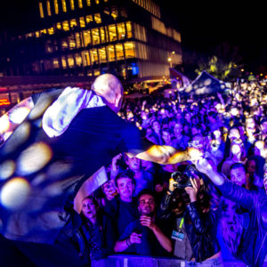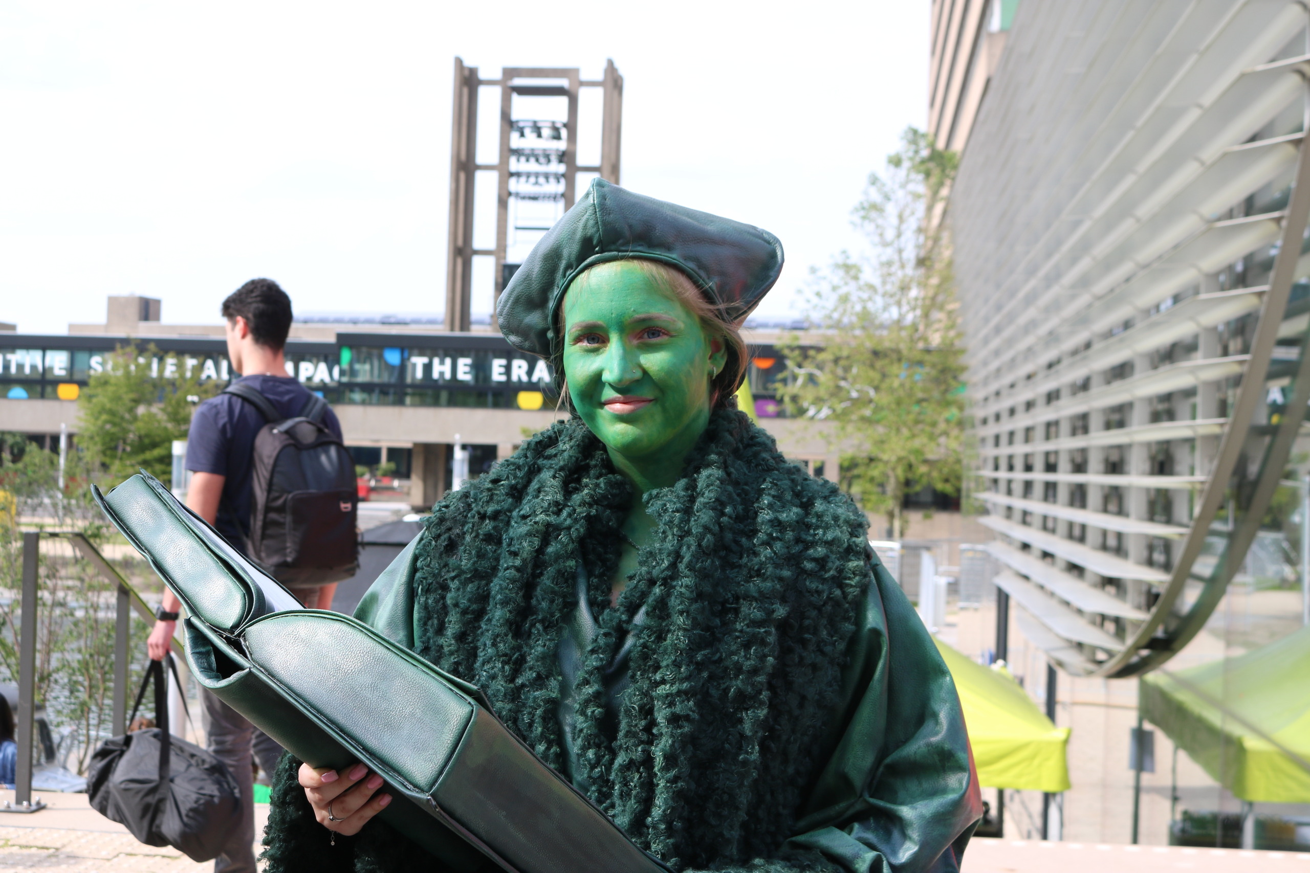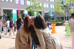 The GDFL Brassband circled around Erasmus Plaza, gathering people to watch and take videos. People were having a macarena dance off in front of the stage. Renee, a third-year Criminology student, was dressed up as Desiderius Erasmus and was walking around in full green attire. People were excited to see her and stopped to take pictures with her. “Some people were praying to me for good grades”, she said. Later in the evening she joined the stage alongside the HeartBeat festival’s mascot.