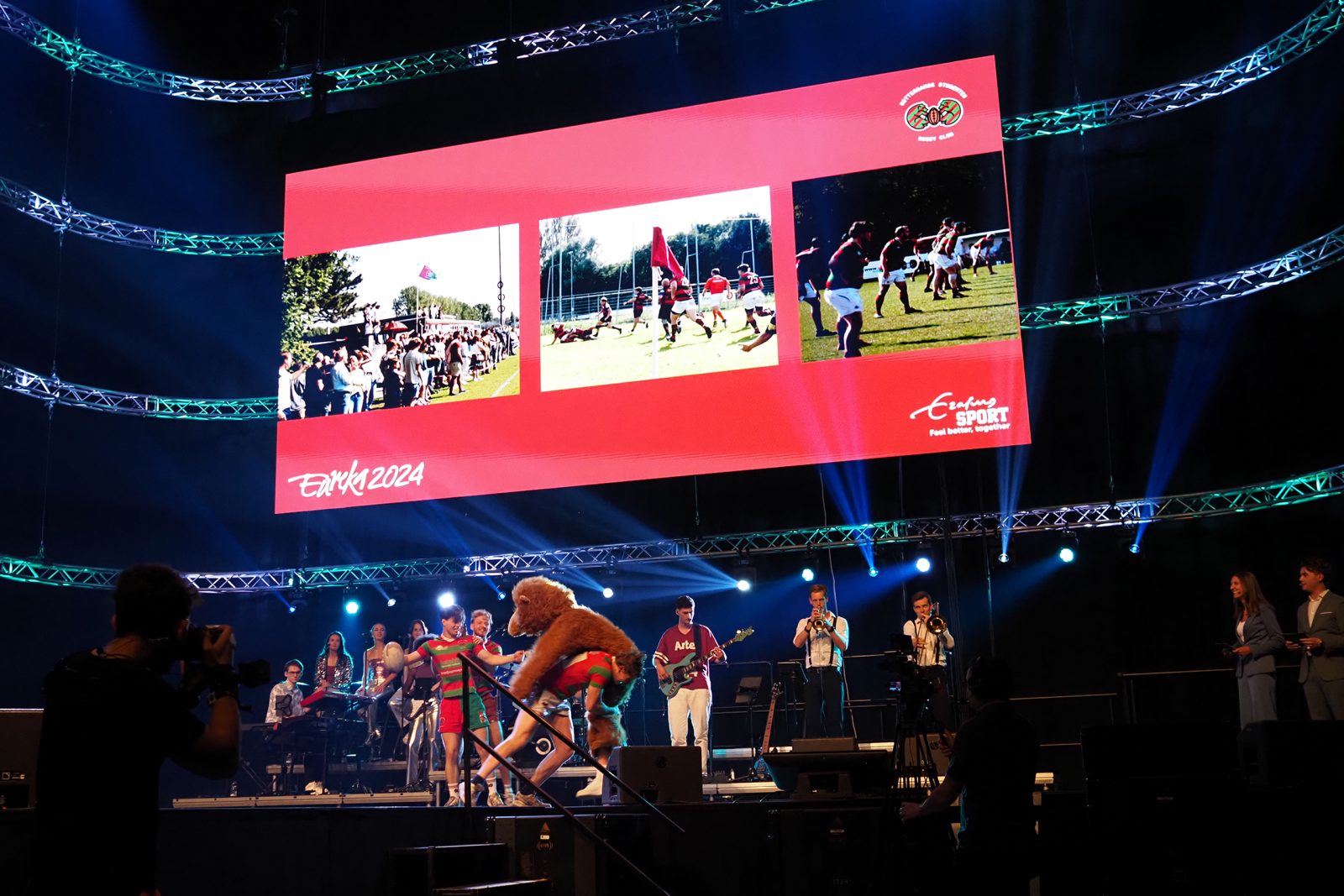 Many of the university’s associations were given a moment in the spotlight by the presenters. They were quickly listed in various categories such as ‘arts and culture’ and study associations. The five social clubs were allowed to briefly wave hello on stage. The sports associations made their entrance by running, throwing, diving and – in the case of the rugby club, as is tradition – tackling. Most items stayed neatly on the stage, but the squash club sent their balls flying into the audience.