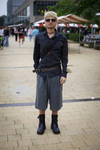 As it starts to rain on campus, there’s a flurry of activity as the stalls at the campus market are hastily packed away and anything that could get wet is quickly covered. Students dash into the food plaza. Amid the crowd, Kevin Barkmeijer (24) strides through in sturdy, square-toed leather boots. Tall, with bleached white hair and thick black eyebrows, his face lights up as he begins talking about his outfit. He combined comfort – a casual blouse – with a misjudgement of the weather, hence the denim jorts. He rarely plans his outfits in advance. This morning, after a long night at Maassilo, he quickly threw it together. Getting dressed is easier when he’s a bit hungover: “Fewer inhibitions or something.”