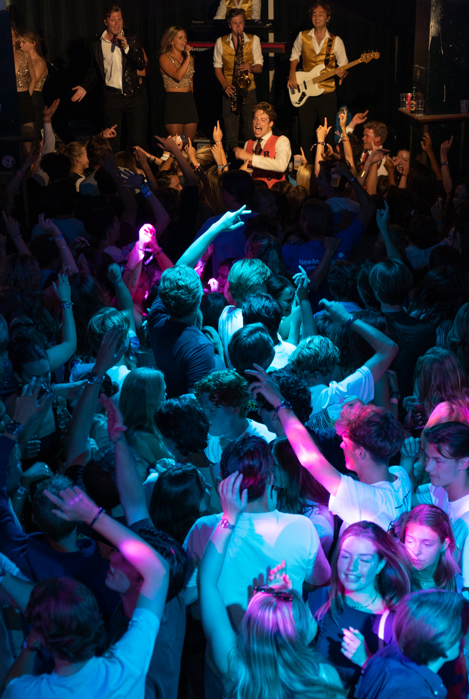 Cycling along, Sander and Ramon observe their surroundings, sometimes side by side for a comment or question, then single file again. They pause on Lusthofstraat, watching students walk by and ensuring they get home safely. That seems to be the case, so they head back towards RSC/RVSV, where the queue at the door barely fits on the pavement. Once the door closes, entry is no longer possible. That moment is near, so there’s a sense of urgency. Suddenly, everyone is swiftly inside dancing to the Hermes House Band.