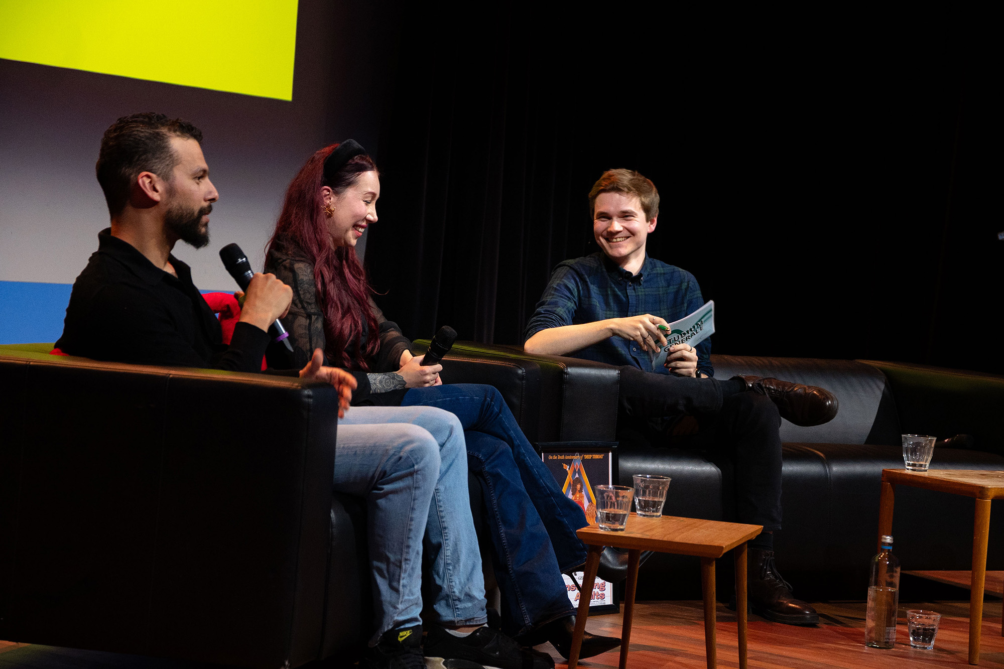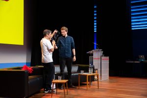 On stage, the researchers reproduce some of the experiments they conducted at Lowlands music festival for the research. First, the conference’s host and the researcher Lena van de Lande sit together in the ‘Pornfession booth’, where a red curtain only allows them to hear each other. There was a similar set-up at the festival where Van de Lande listened to festival-goers’ sexual confessions as a kind of sex priest.