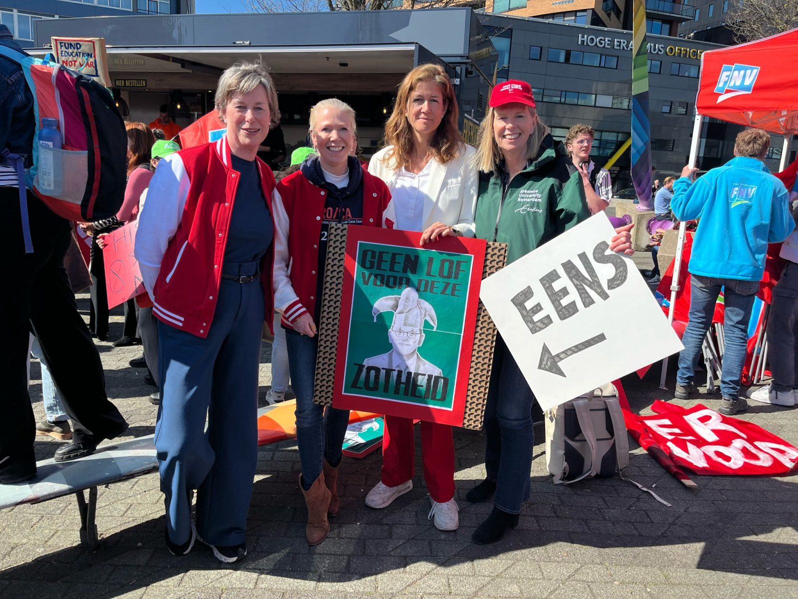 At Erasmus Plaza, dozens of lecturers and a few students have gathered around the picnic tables to create banners for this afternoon’s protest in the city. On large red boards, attendees are writing messages with thick markers such as ‘Eppocalypse’, ‘PlEURrt op’ (Go EURway!), and ‘Doe het niet’ (Don’t do it). Lists of various slogans for inspiration lie on the tables. “Without knowledge, there is no future”, says psychology tutor Laura Hamran. She writes in bold letters ‘We are innovation, we are the future’ on a board. “I am here for the students. If we as lecturers cannot do our jobs properly, the students will suffer.”