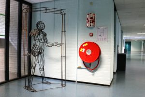 “It’s a mystery where it came from or who made it”, says Luuk Bode of the art department. The sculpture, a humanoid figure made of steel wires, has been there at least as long as Luuk has, around a decade. The artwork is on the second floor, near the stairwell further down the corridor. “We’ve tried googling it, but there are quite a lot of steel-wire works out there”, explains Bode. He adds that there is no recognisable ‘handwriting to it’. He couldn’t find an artist matching this style in his research.