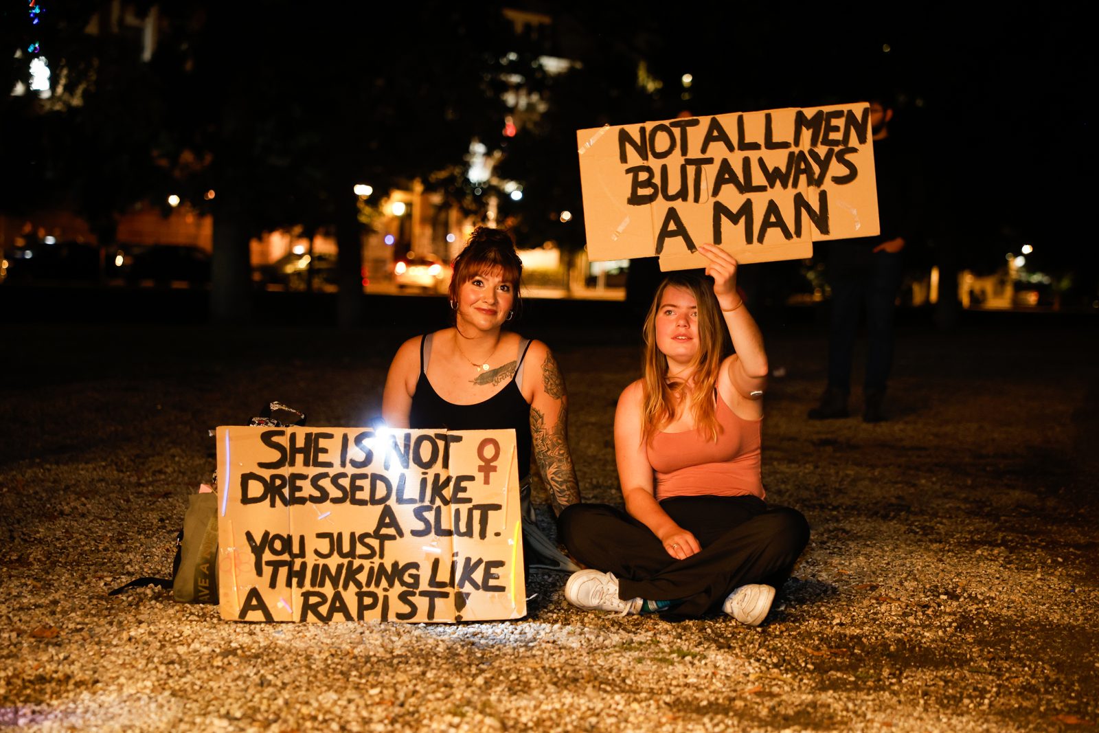 Eva (27) came to the protest with three other women and two men. One of her friends carries a sign reading ‘Protect your daughters. Educate your sons‘. “Good that there are a lot of men here tonight as well”, says Eva. “We shouldn’t be the ones to have to adapt, the perpetrators must stop.” Men should call each other out on inappropriate remarks and behaviour, she thinks. “I find the evening quite intense. It’s beautiful and emotional to hear all those names and see how many people recognise this. If so many people experience this, then something really needs to change quickly. But I also don’t know how you do that, or where to start.”