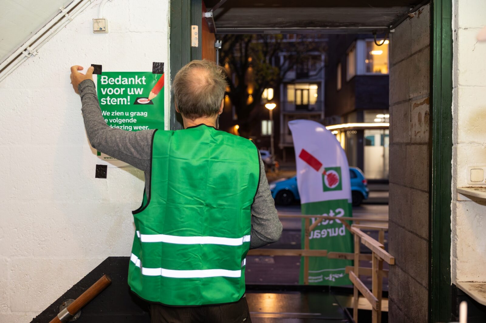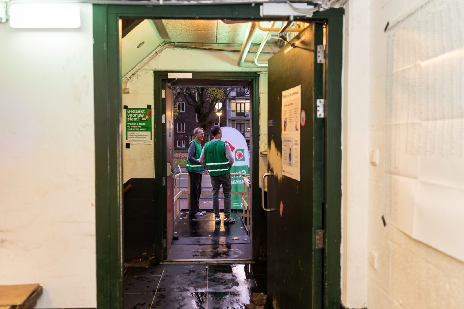 At sunrise, at 7.28, the first voters arrive. So they still have to wait two minutes. Immediately four young men are waiting, three in white trainers and one in suede pointed shoes. Three have their hair slicked back. When asked why they are so early, they answer in unison: “we still have to get to the office!” Job has just graduated in Business Administration and is heading to Amsterdam for his internship at KLM. “It’s the nearest station, and I was a member and still like to come.” He is third in line.