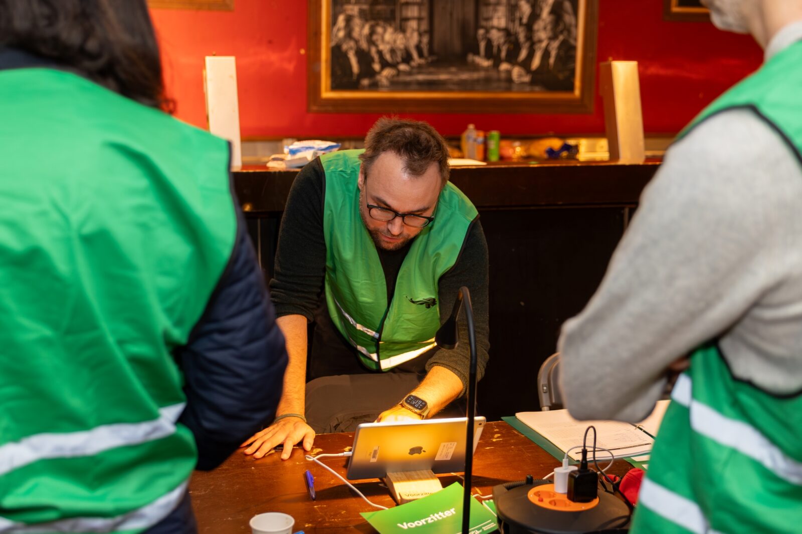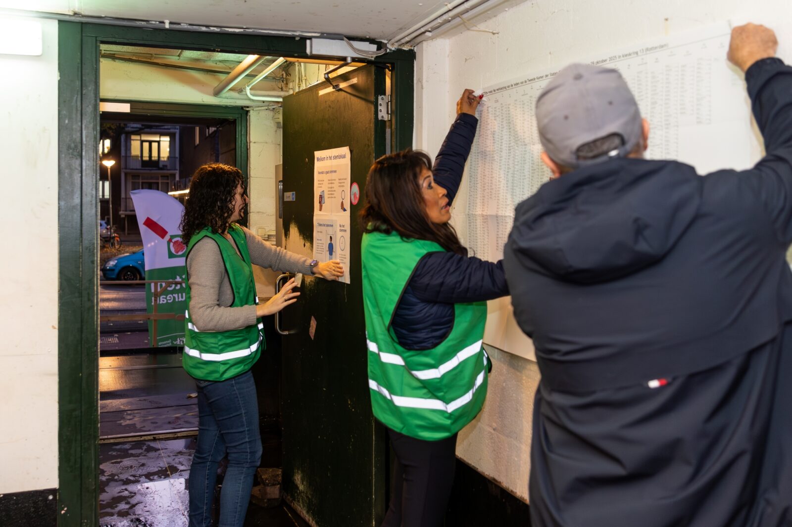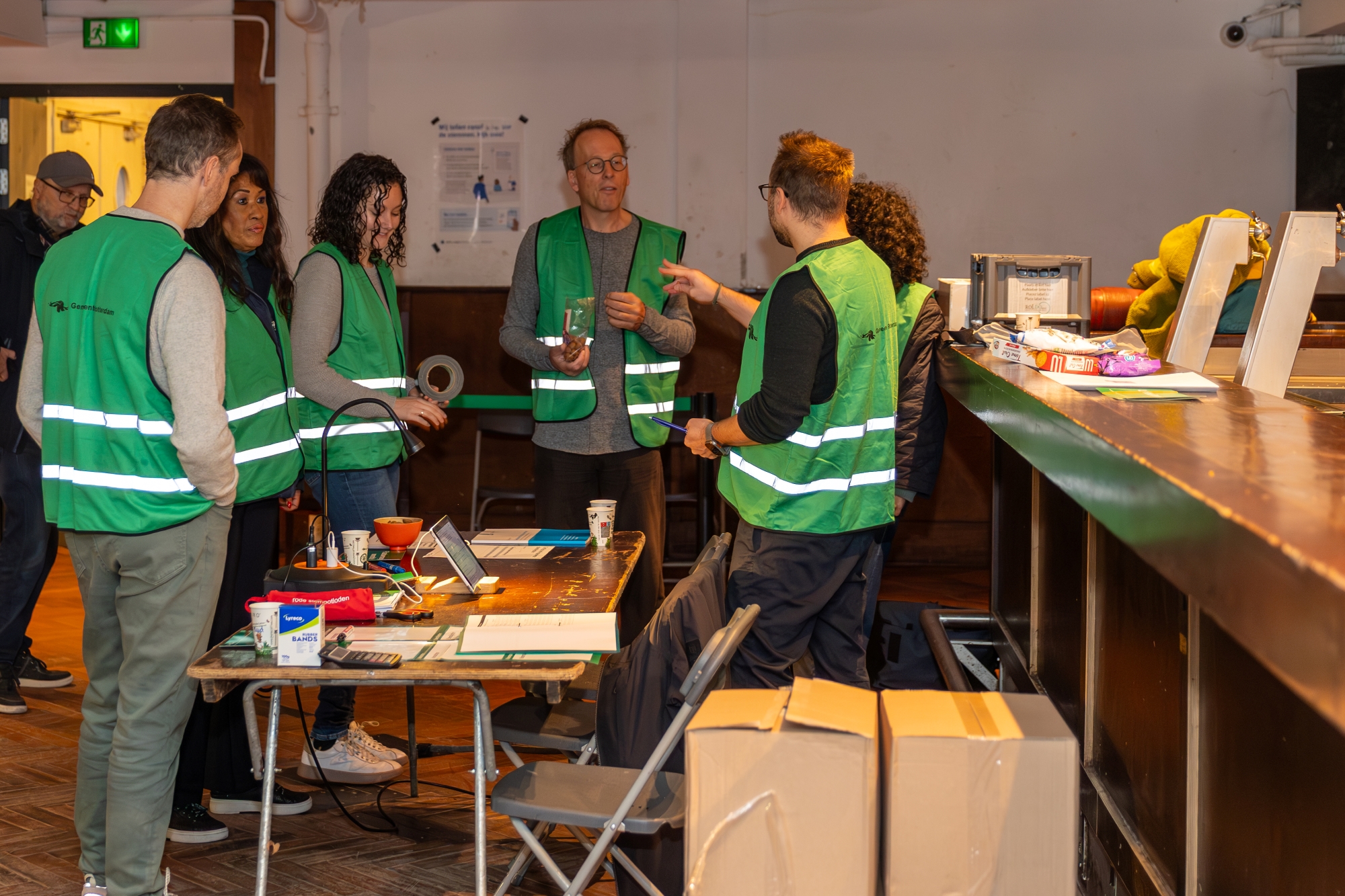 Jillian checks that the ballot boxes are truly empty at opening. The posters are put up: the enlarged candidate list in the corridor, the thank-you-for-voting poster by the exit. Tea and coffee are made behind the bar. Michel looks around the building for a chair with armrests – because that is required by the rules, says Jillian. “There must be at least one chair with armrests for people who have difficulty walking, for if they want to watch the voting process or the counting.” Mohammed finds it a bit dark inside and fetches a lamp with a small fluorescent tube from home. After the division of tasks (“We rotate everyone, except the role of chair”) and a discussion about snacks (“Let’s start with the kruidnoten“), polling station 668 is ready.