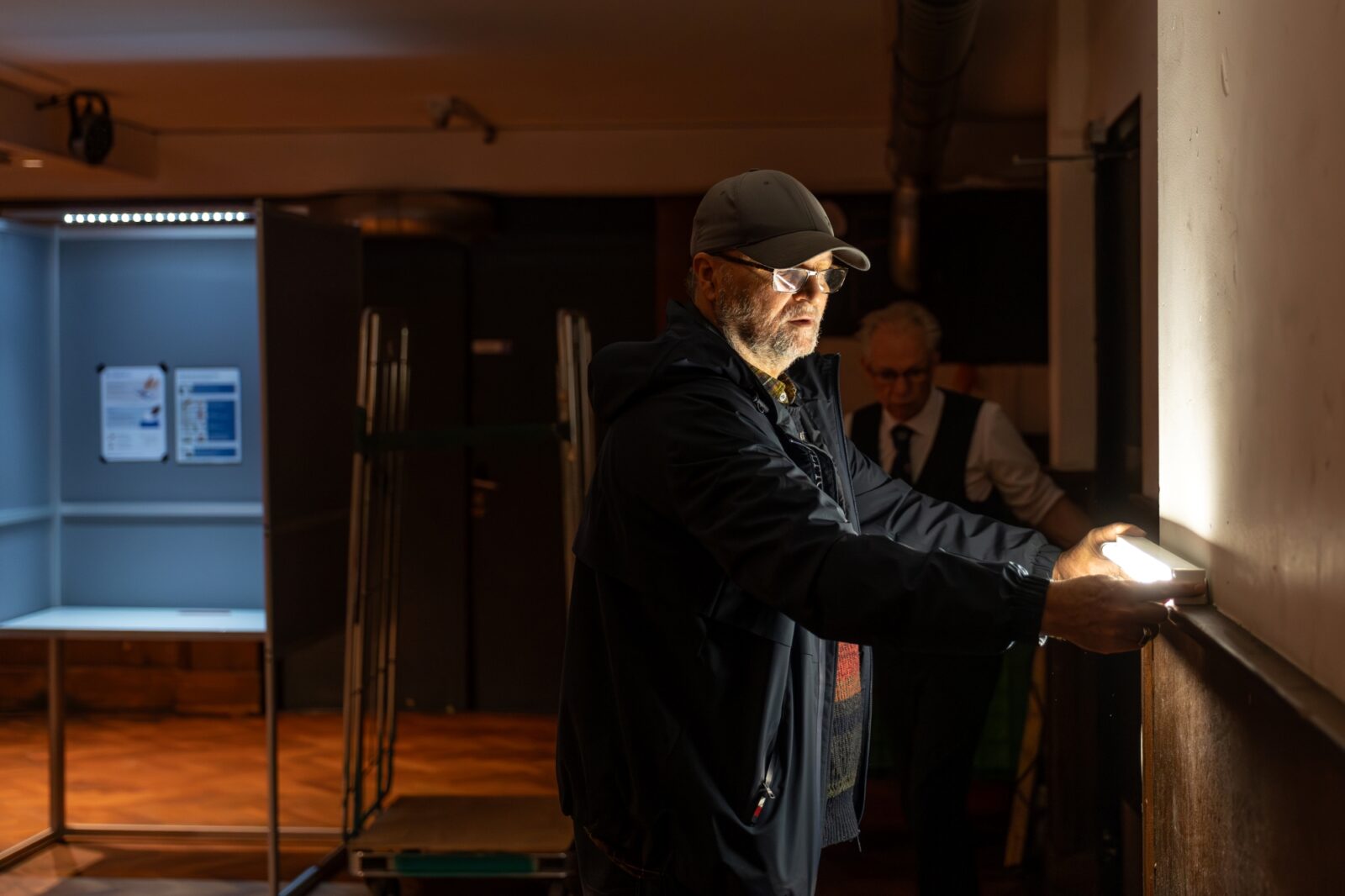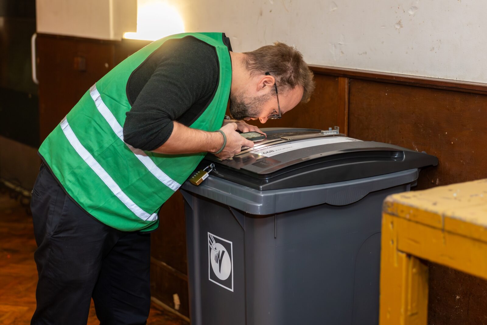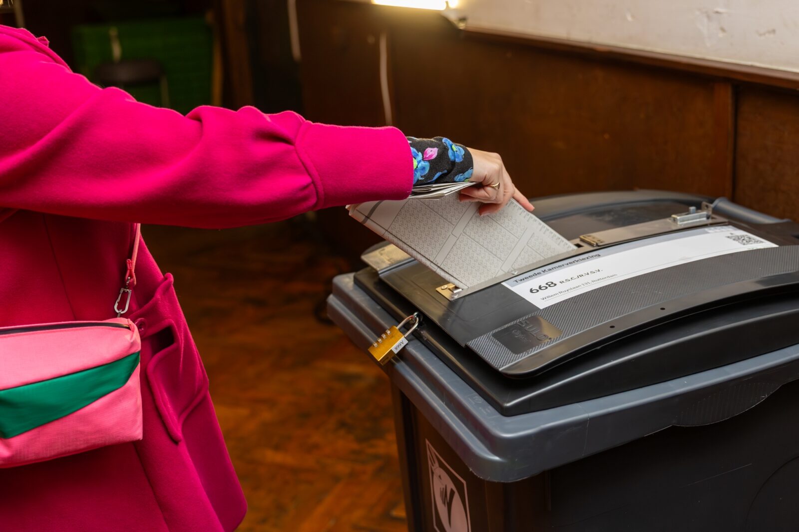 Jillian checks that the ballot boxes are truly empty at opening. The posters are put up: the enlarged candidate list in the corridor, the thank-you-for-voting poster by the exit. Tea and coffee are made behind the bar. Michel looks around the building for a chair with armrests – because that is required by the rules, says Jillian. “There must be at least one chair with armrests for people who have difficulty walking, for if they want to watch the voting process or the counting.” Mohammed finds it a bit dark inside and fetches a lamp with a small fluorescent tube from home. After the division of tasks (“We rotate everyone, except the role of chair”) and a discussion about snacks (“Let’s start with the kruidnoten“), polling station 668 is ready.