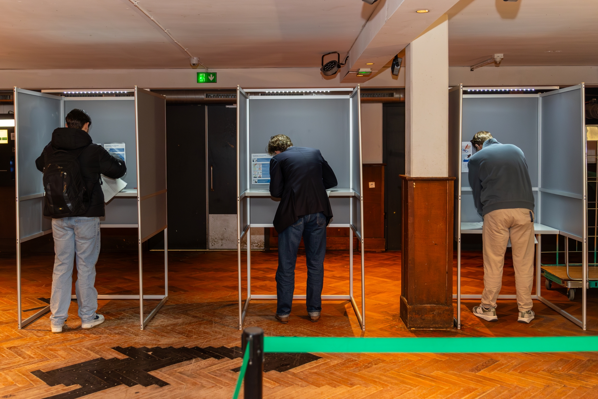 At that moment an emeritus professor passes by who has just voted. To the woman at the exit he says: “How smoothly organised this is. What a wonderful country we live in, that we can do this.” Two students are in the queue that forms. “So, you just hand over the card and then you can vote?” “Sweetie, I really have no idea either.”