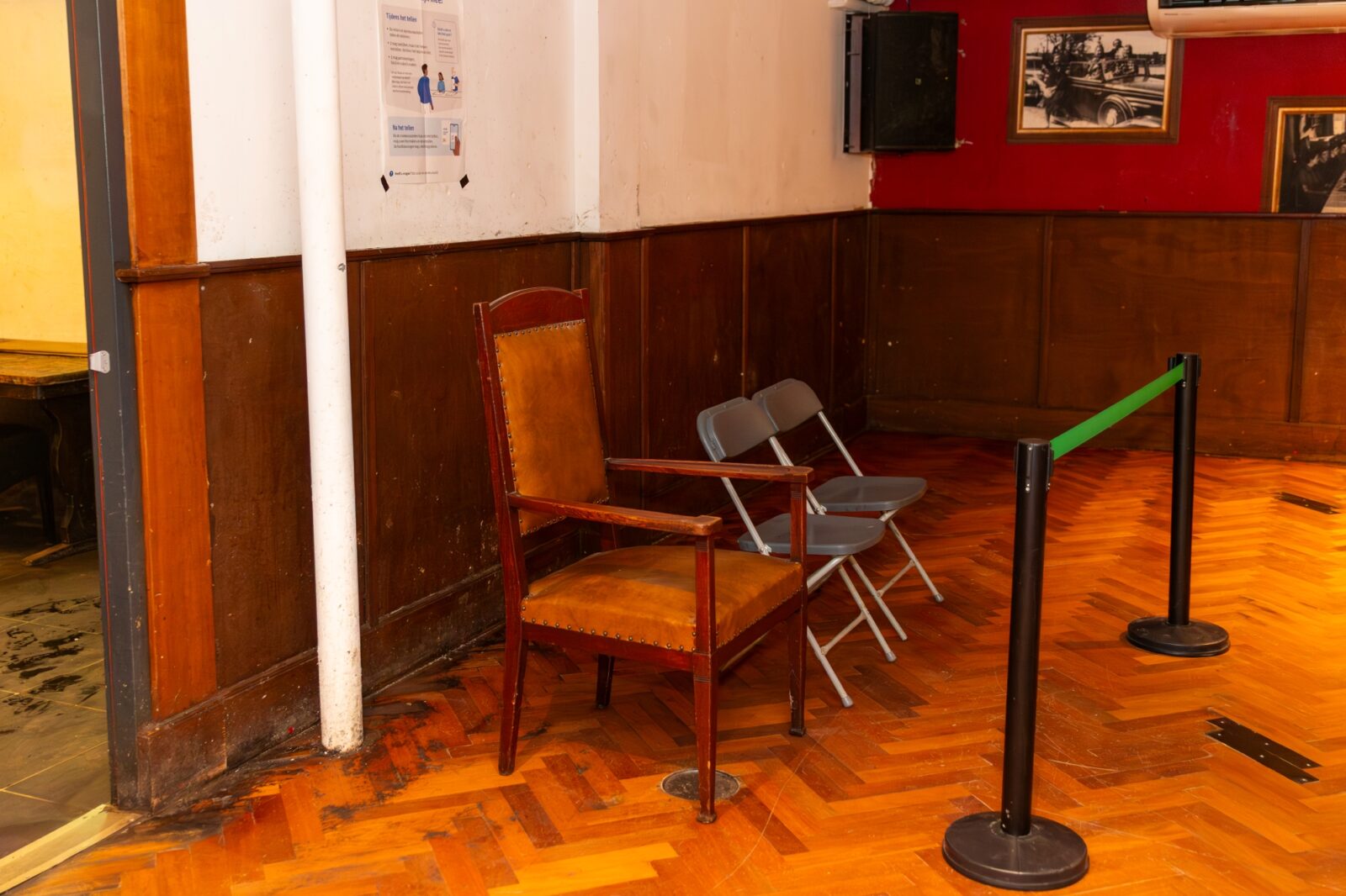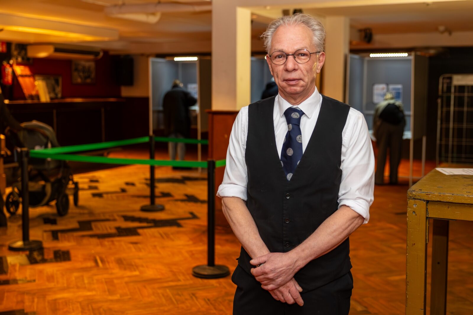 A local resident in a tailored brown pinstripe suit with a pram says: “We live almost next door, so this location is the easiest. And it’s certainly nice to be able to look inside.” Jolanda, in her white coat with a fur collar and leopard-print bag, has lived around the corner for thirty years. She laughs at the slightly sticky floor. “That was to be expected, because they can party here, you know. Fortunately the nuisance has decreased in recent years. Since it’s possible, I always vote here. So convenient being so close.”