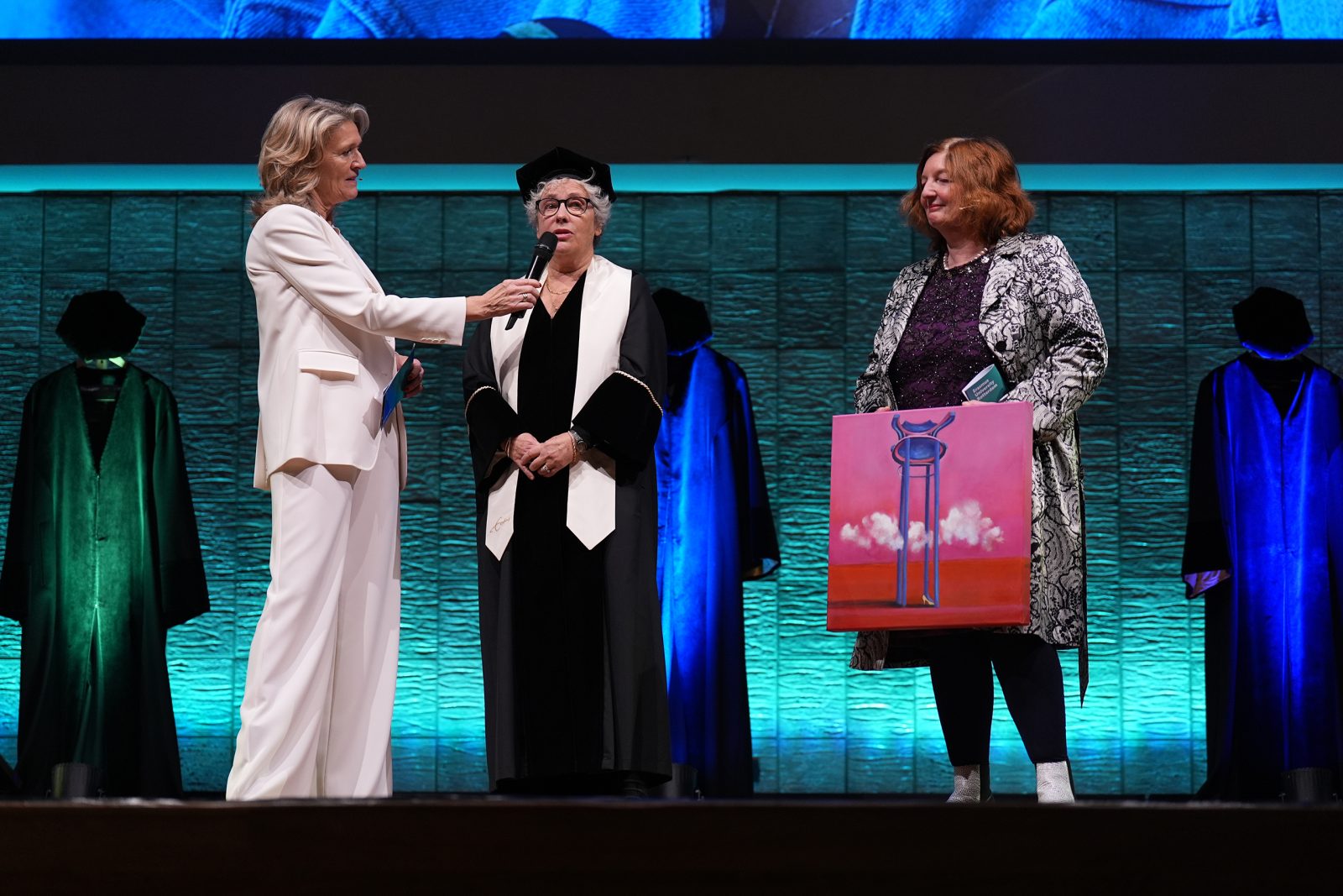The final award of the afternoon, the FAME Athena Award for individuals committed to gender equality, was presented by Executive Board vice-chair Ellen van Schoten to Wendy Harcourt of the International Institute for Social Studies. According to Van Schoten, Harcourt is a loyal ally for women who are still at the beginning of their academic careers. Harcourt herself cited colleagues from the Global South as her role models and called for ‘solidarity in these turbulent times’.