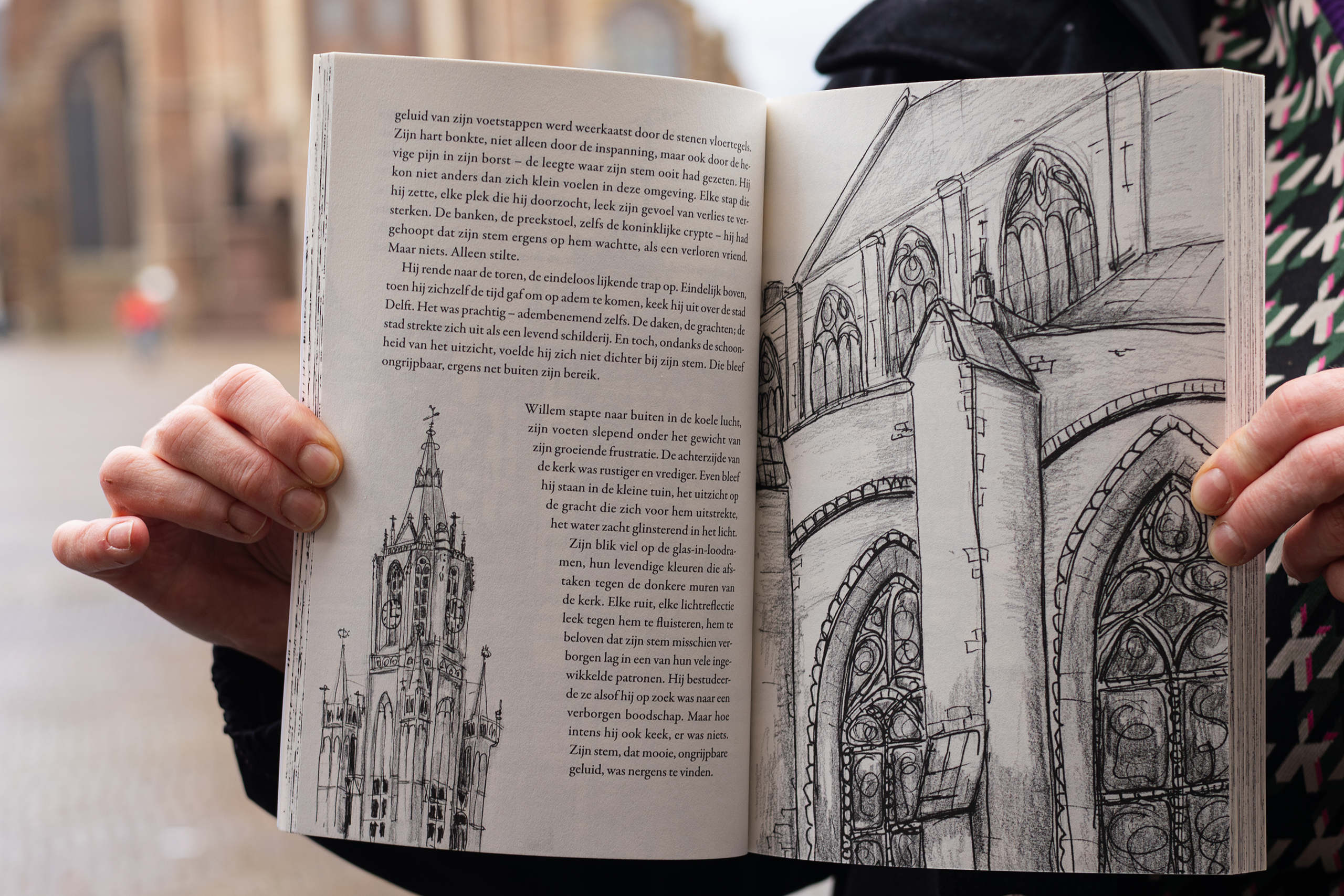 In the book, 11-year-old Willem sets out to find his voice. Willem loves to sing – often and beautifully – until one day he suddenly can’t sing anymore. His quest takes him from Delft, where Van Schoten has lived since taking up her job in Rotterdam, to England and Wales, passing the cityscapes, half-timbered houses and cathedrals that Van Schoten sketched on location: from the leaning tower of the Oude Jan and the back of the Hugo de Groot statue in Delft, past the monumental Newcastle Castle and York Minster, to the fishing boats off the Welsh coast in Tenby.