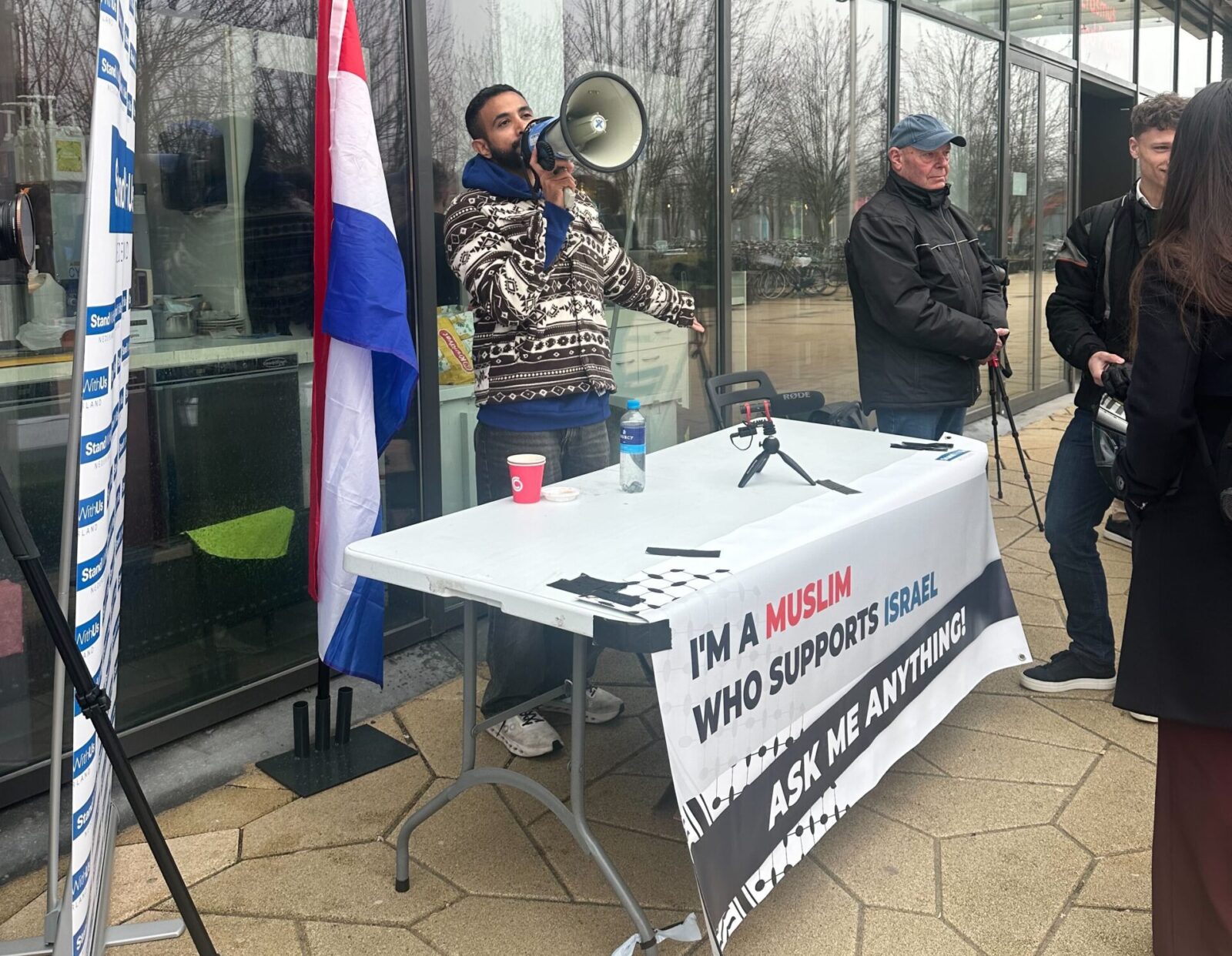 Right outside of the Sohmi restaurant, the pro-Israel activist Luai Ahmed sits behind a small table. Cameras to his left and right record every interaction for his social media accounts and next to Ahmed, a representative of the pro-Israel organisation StandWithUs puts down a folding chair, for people who want to engage in conversation with him. Next to the table the Dutch flag is raised and a banner is duct-taped to the table. “I am a Muslim who supports Israel, ask me anything”, it reads.