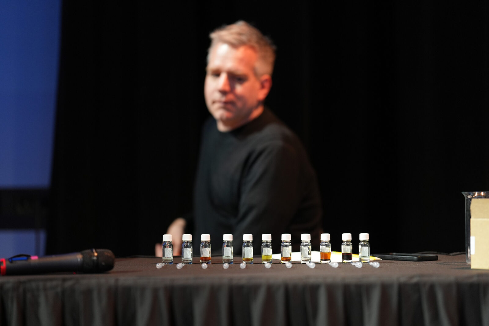 The scents that Bloem created for the film are contained in small bottles. There are eleven scenes. Each of those scenes has its own distinctive smell. But the pure scent substances alone are not enough to fill the hall with fragrance.