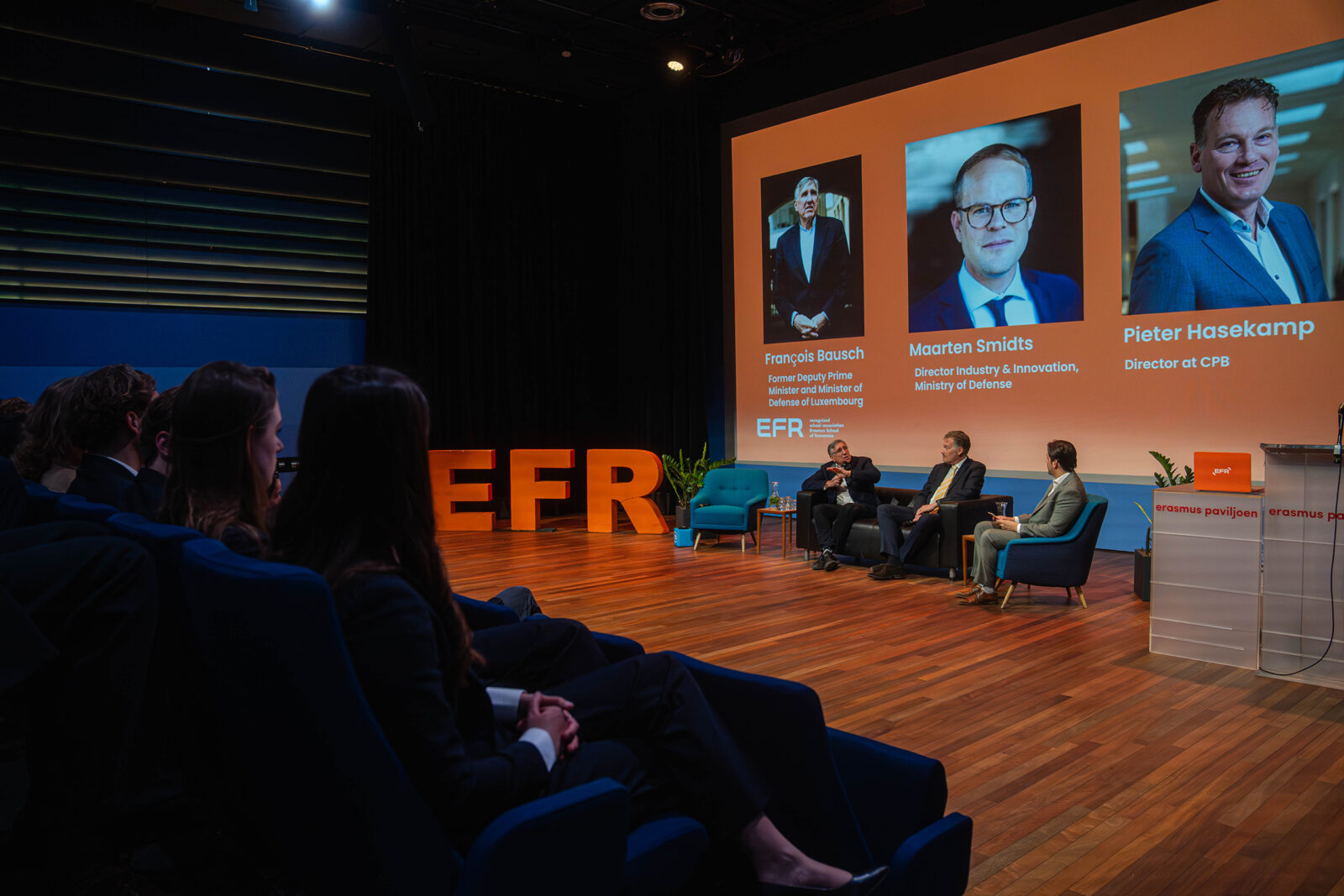 The presentation took place during the EFR Inspiration Days. It was a busy day for Karis. Earlier that morning he spoke with the king at Palace Huis ten Bosch and visited prime minister Rob Jetten in The Hague. In Rotterdam he met around one hundred and fifty students and alumni – Woudestein is familiar ground for the president of Estonia: he previously worked here as a researcher.