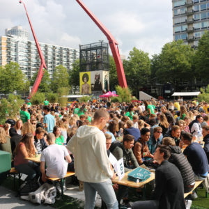 A full English-language opening in De Doelen and uncomfortable interview questions during lunch at the Schouwburgplein. The day ended with a nice party in the Maassilo.