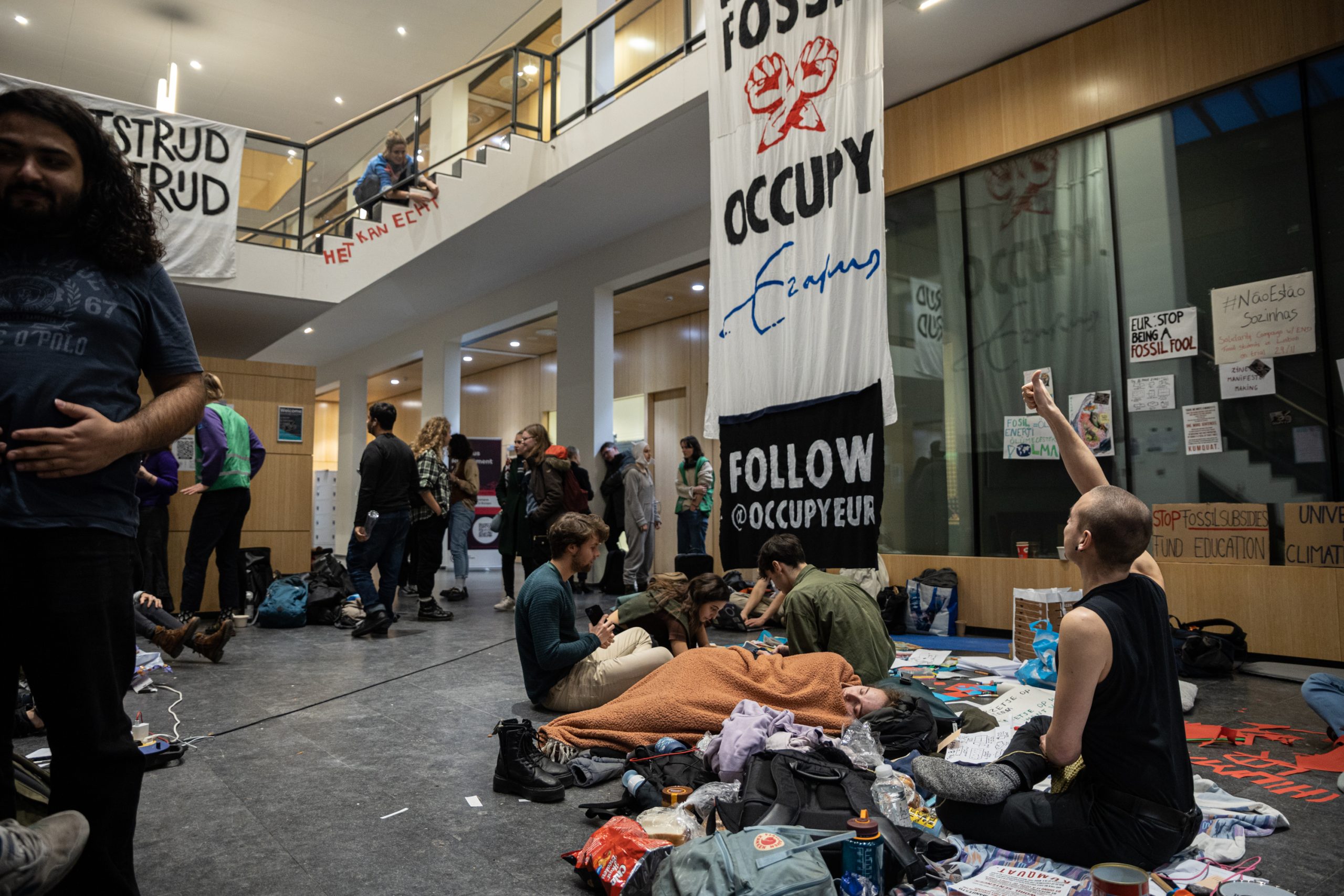 The occupation began on Monday morning. The OccupyEUR group, consisting of students, staff and external climate activists, demands that the university cuts ties with fossil fuel companies, end ‘precarisation’, an end to all student debt and accessibility for everyone.