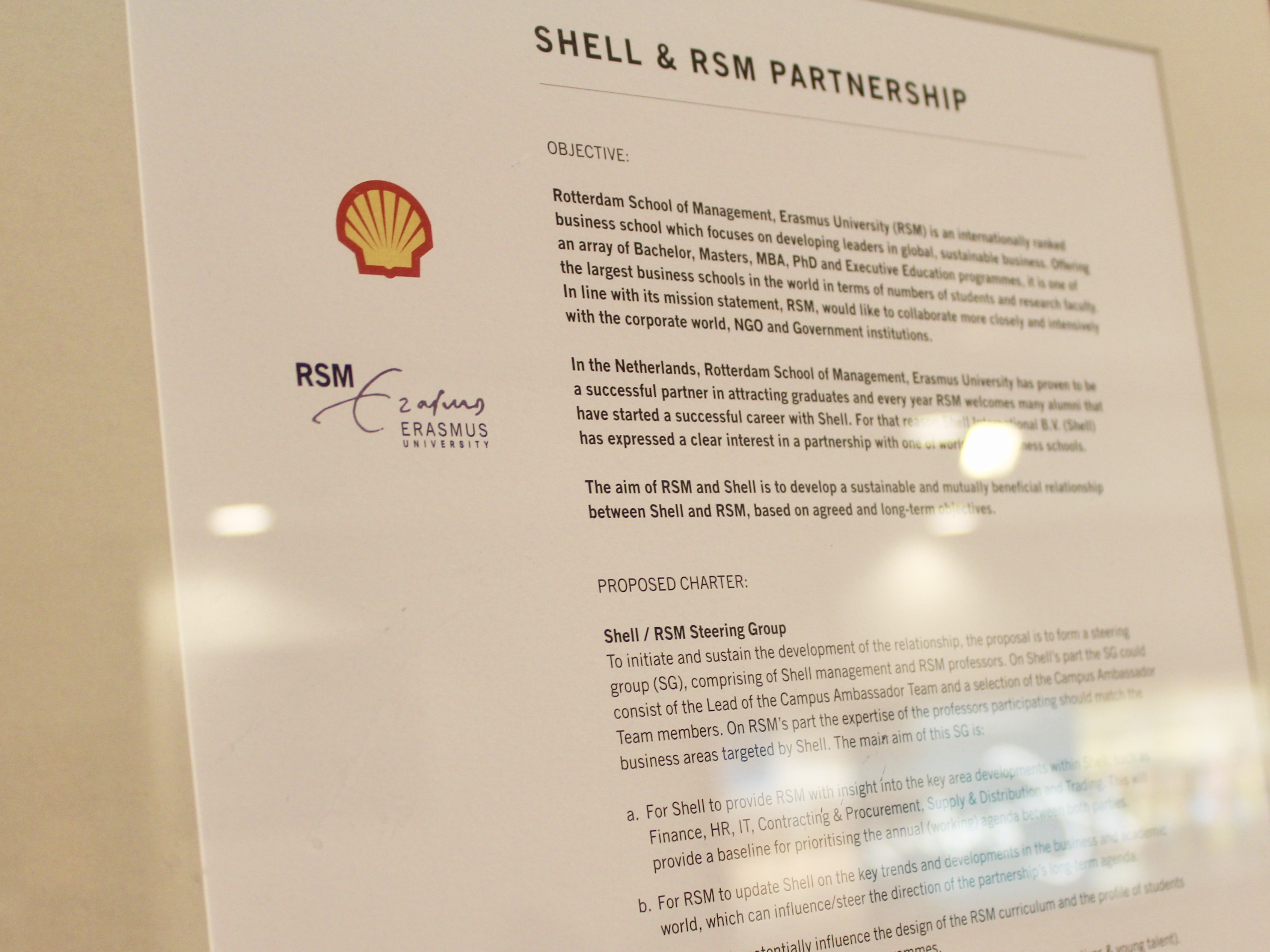 De eerste pagina van het 'Shell & RSM Partnership' hing boven aan de roltrappen van het Mandeville-gebouw.